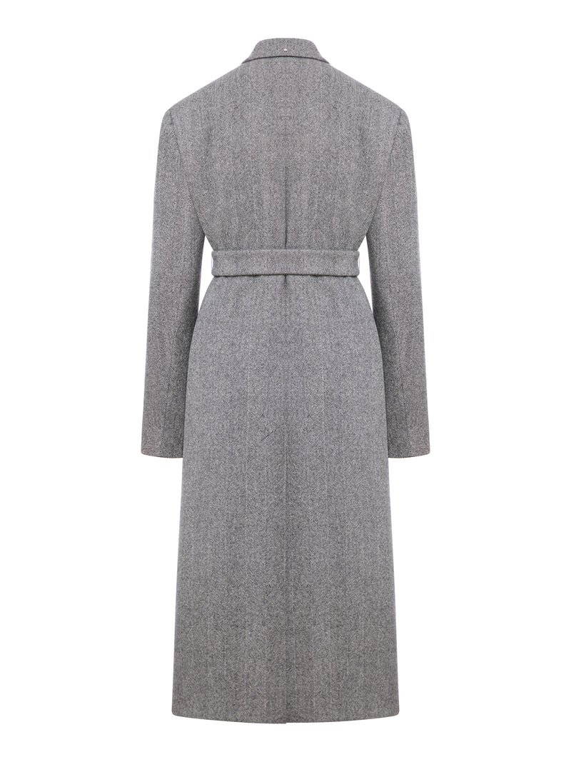 -Peak lapels -Double-breasted button fastening and asymmetrical belt -One chest pocket and two front pockets