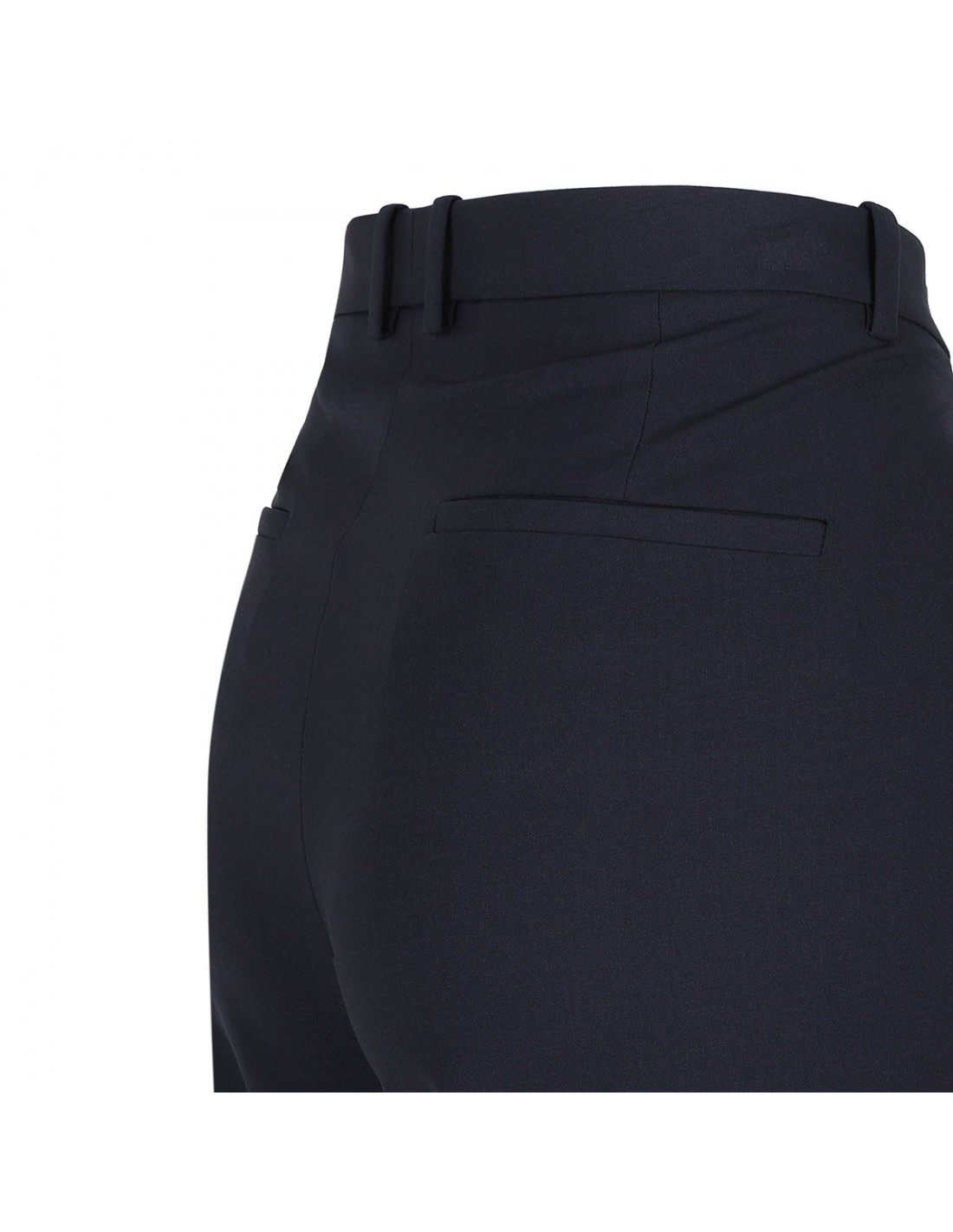 Black wool Demitria pants from Theory featuring flattering silhouette, mid-rise, narrow waistband, pressed creases, belt loops on the waistband, hook-and-zip closure, side and back pockets.