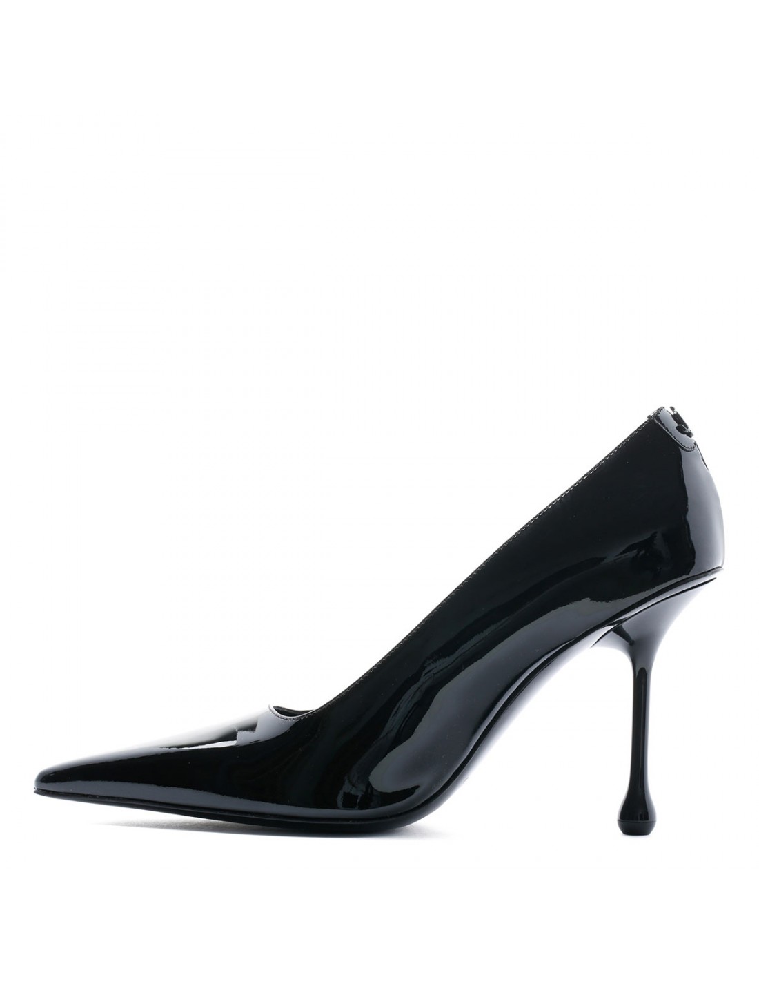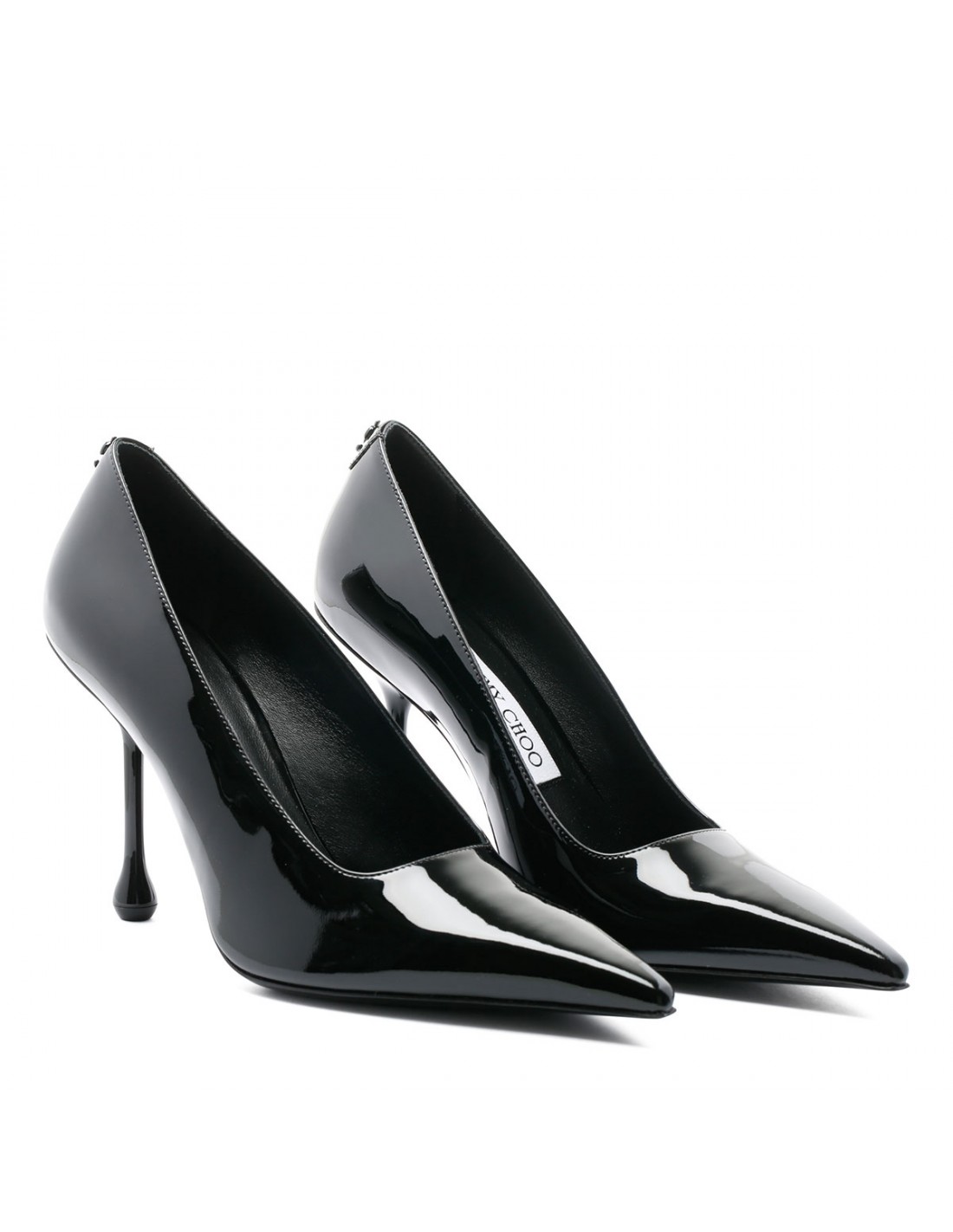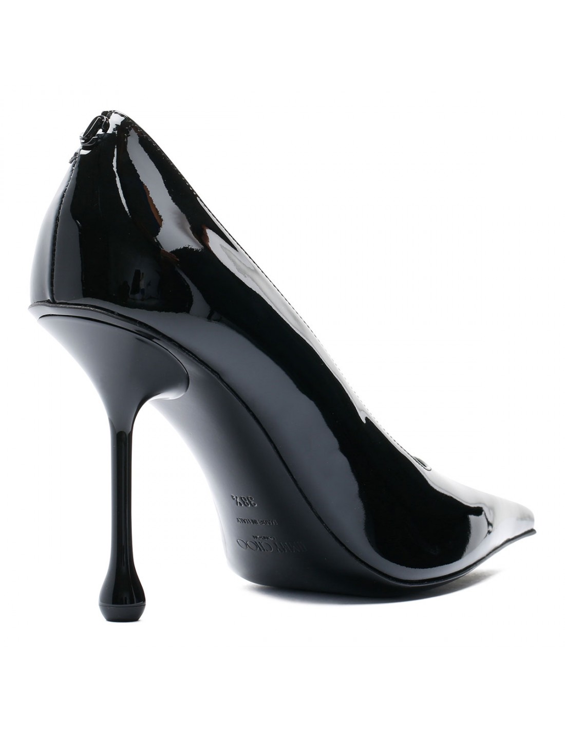 Black patent Ixia pumps from Jimmy Choo featuring pointed toe, square-cut vamp, flattering 95 heel, leather lining, leather and rubber sole.