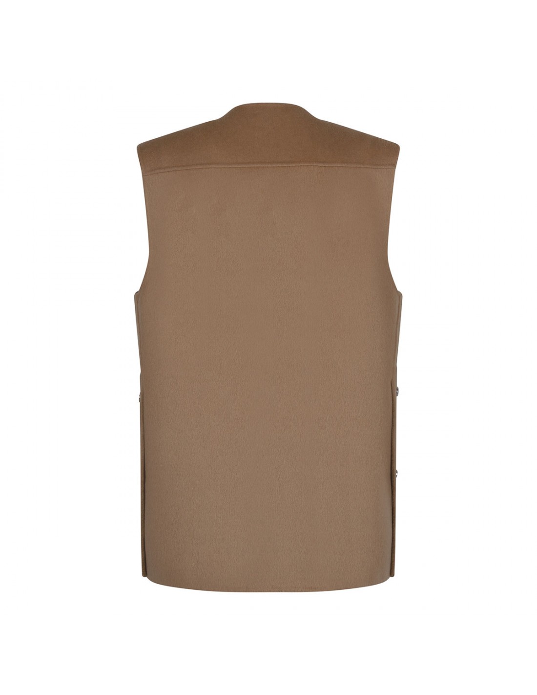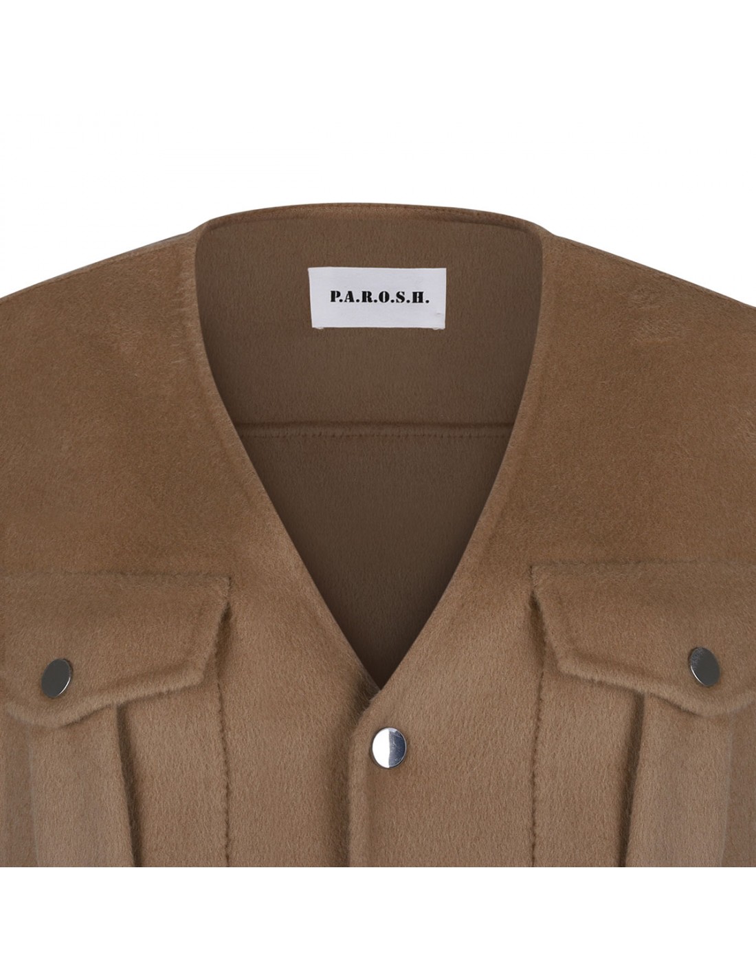 Beige wool vest from PAROSH featuring buttoned flap pockets at chest and front, V-neck, sleeveless style, snap button closure.