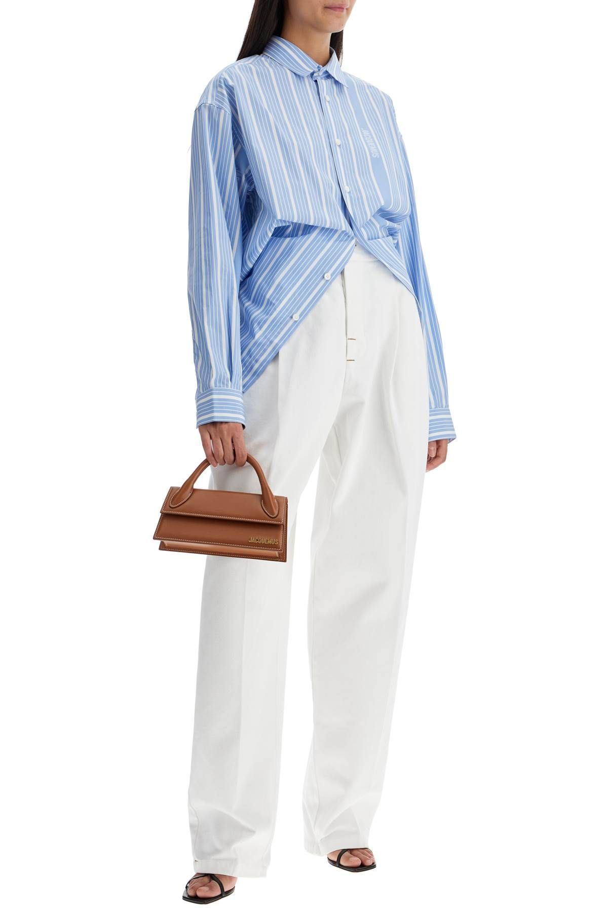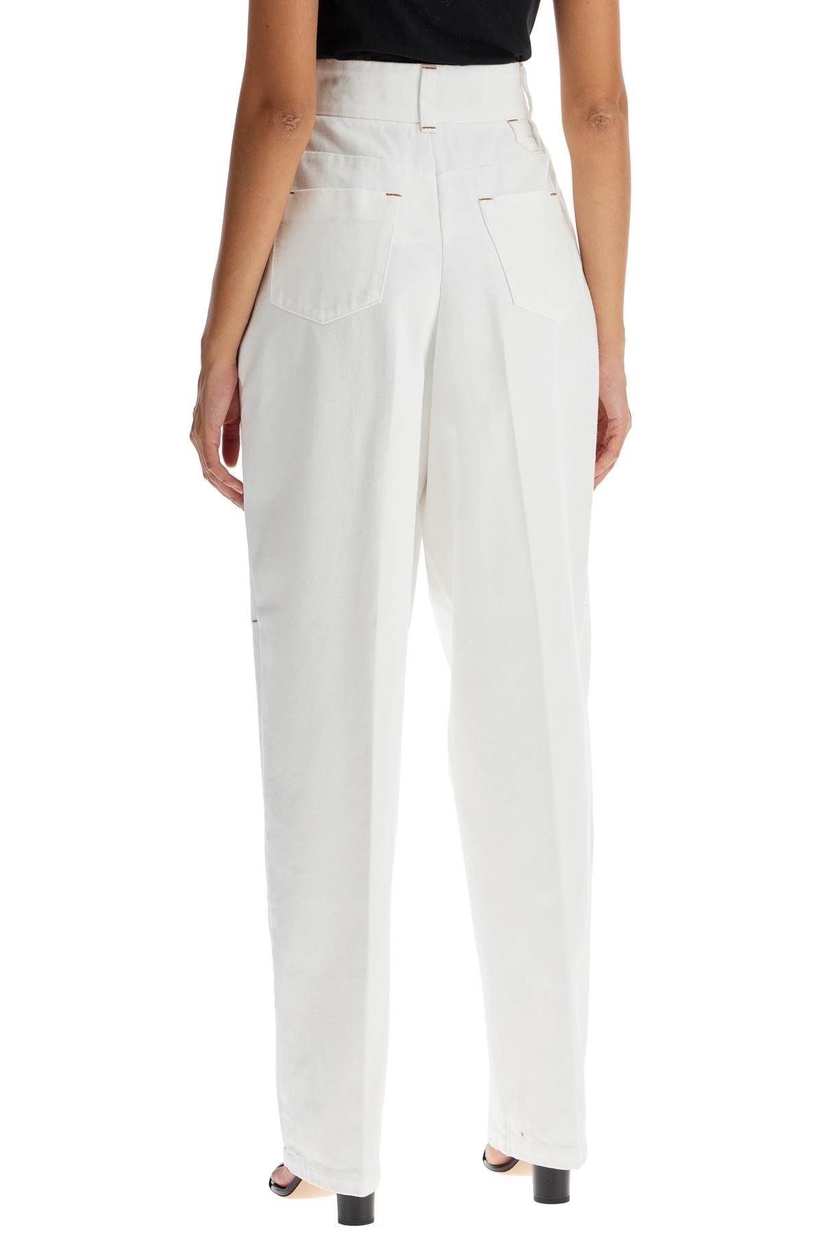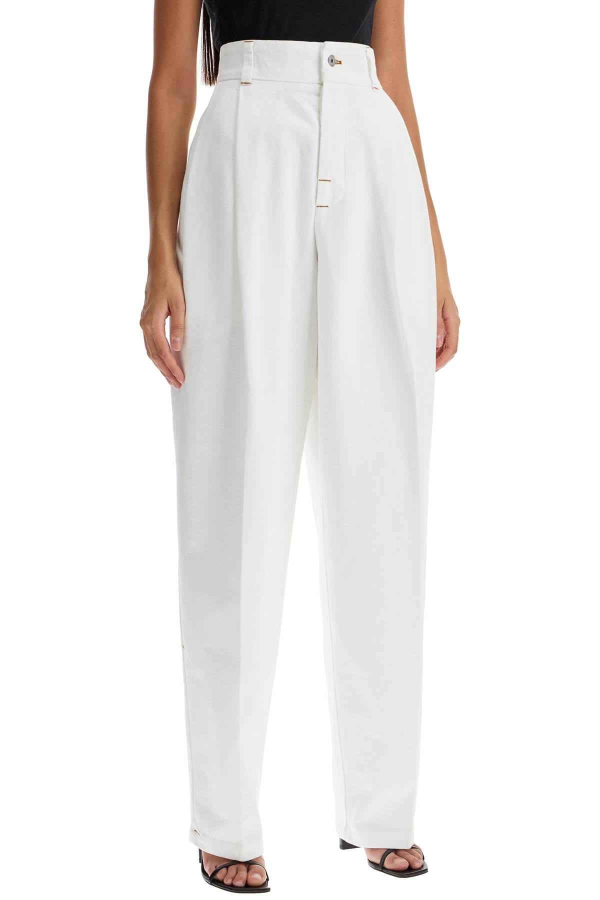 These Jacquemus high-waisted pants are made of white denim and feature a wide double-pleated cut with a tapered leg