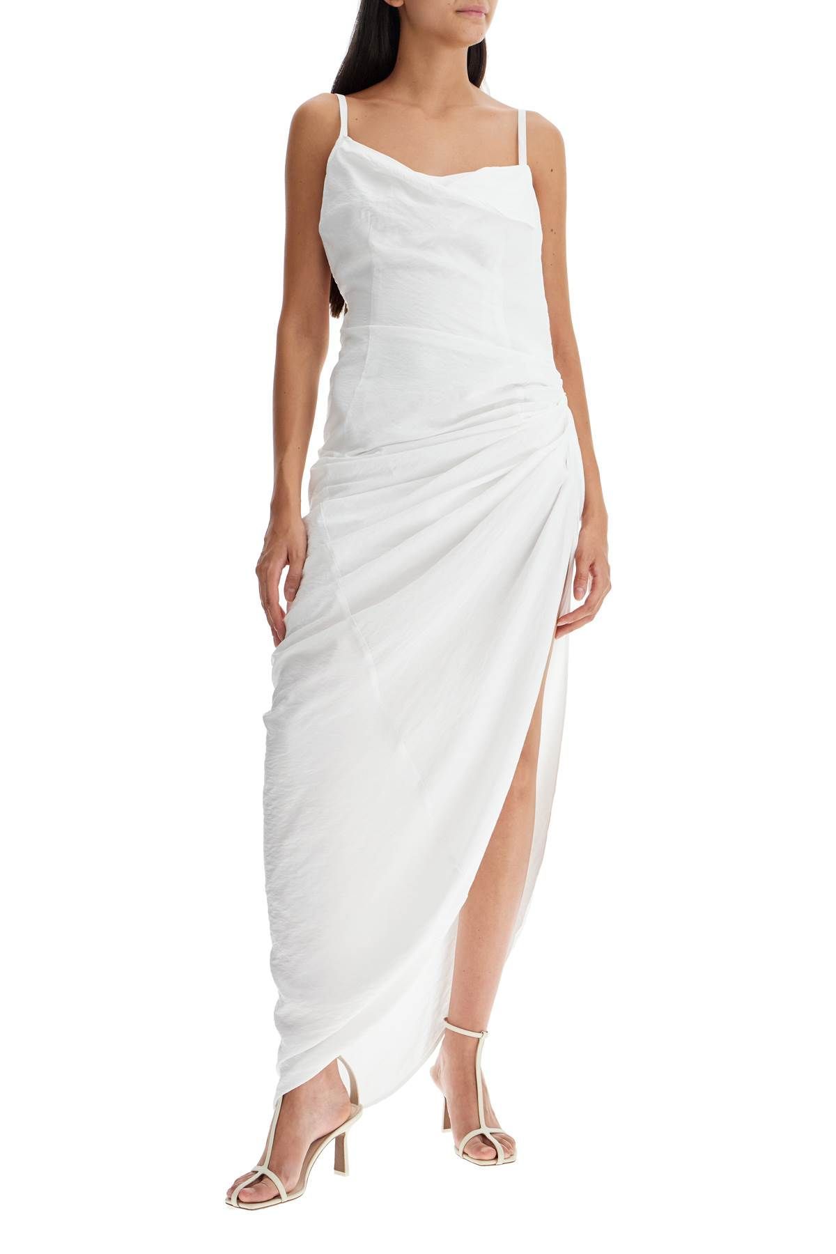 This long Jacquemus dress features an asymmetrical design with draped detailing on the side, made from a crinkled viscose blend twill fabric