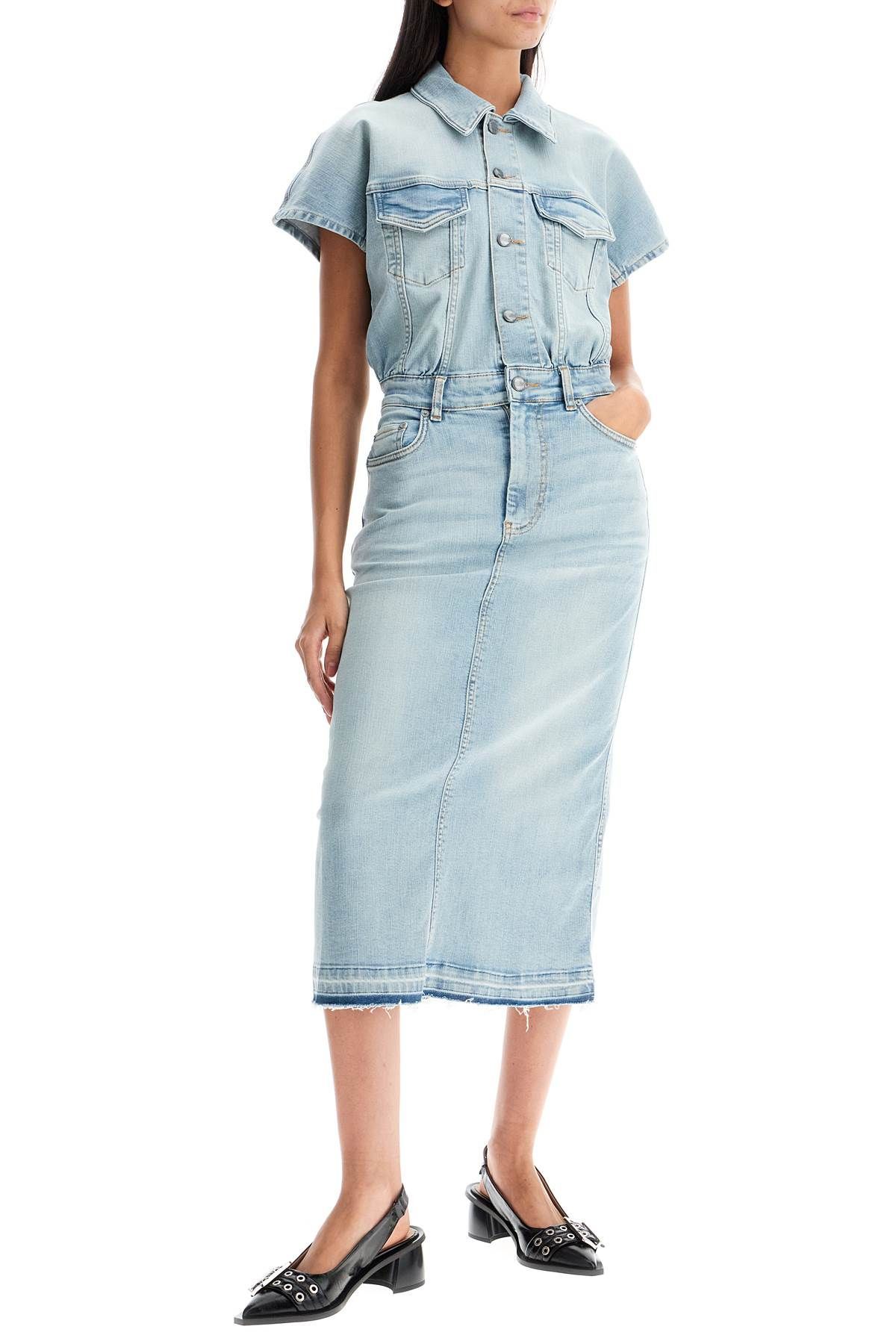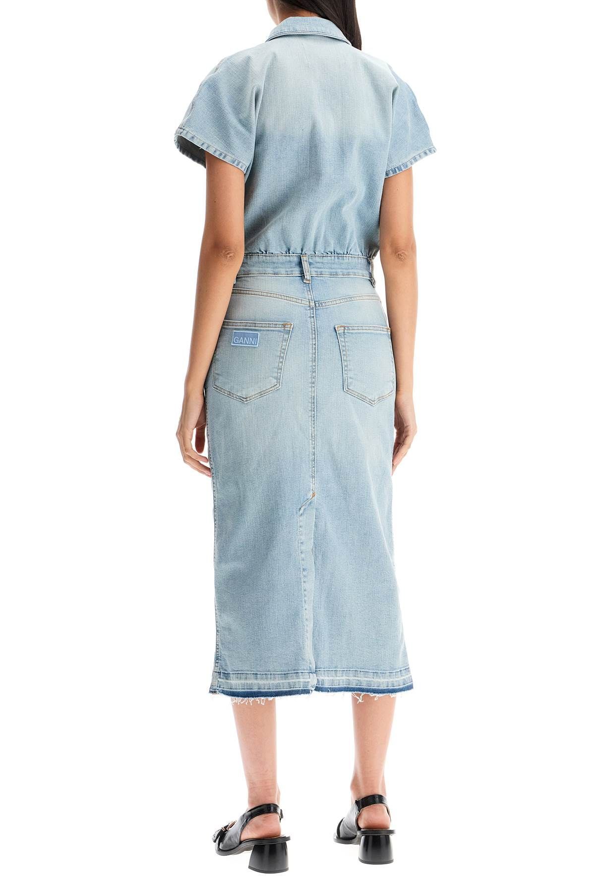 This Ganni midi dress is made of organic stretch denim and features a straight silhouette with short kimono sleeves, a shirt collar, and a five-pocket skirt