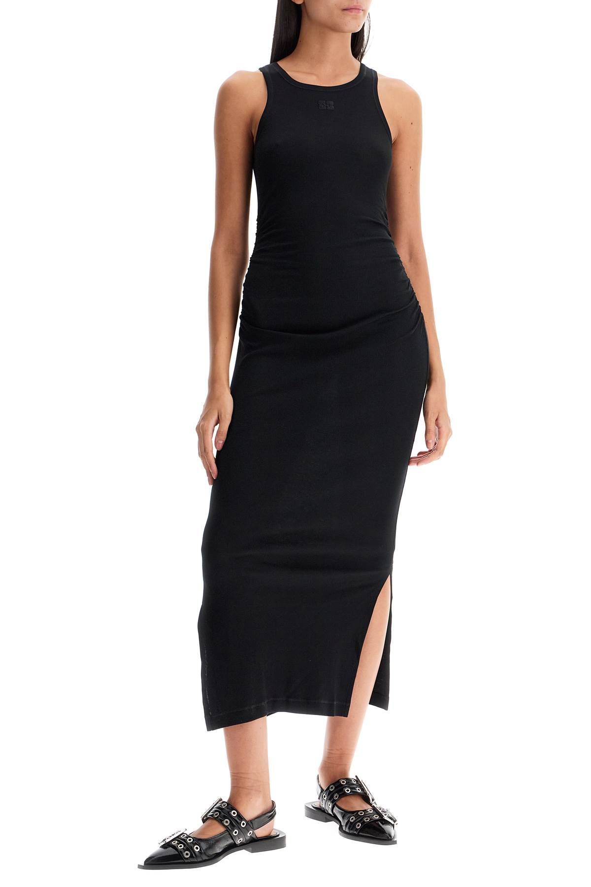 The Ganni sleeveless dress has a fitted silhouette with ruching and side slits