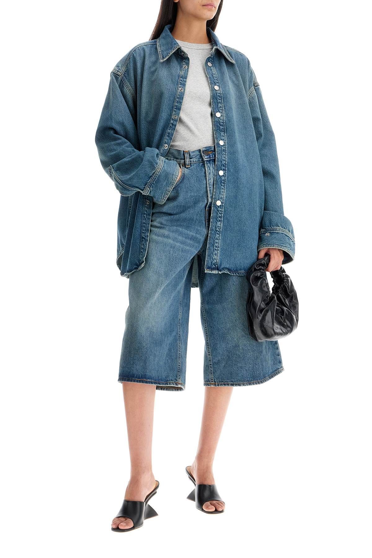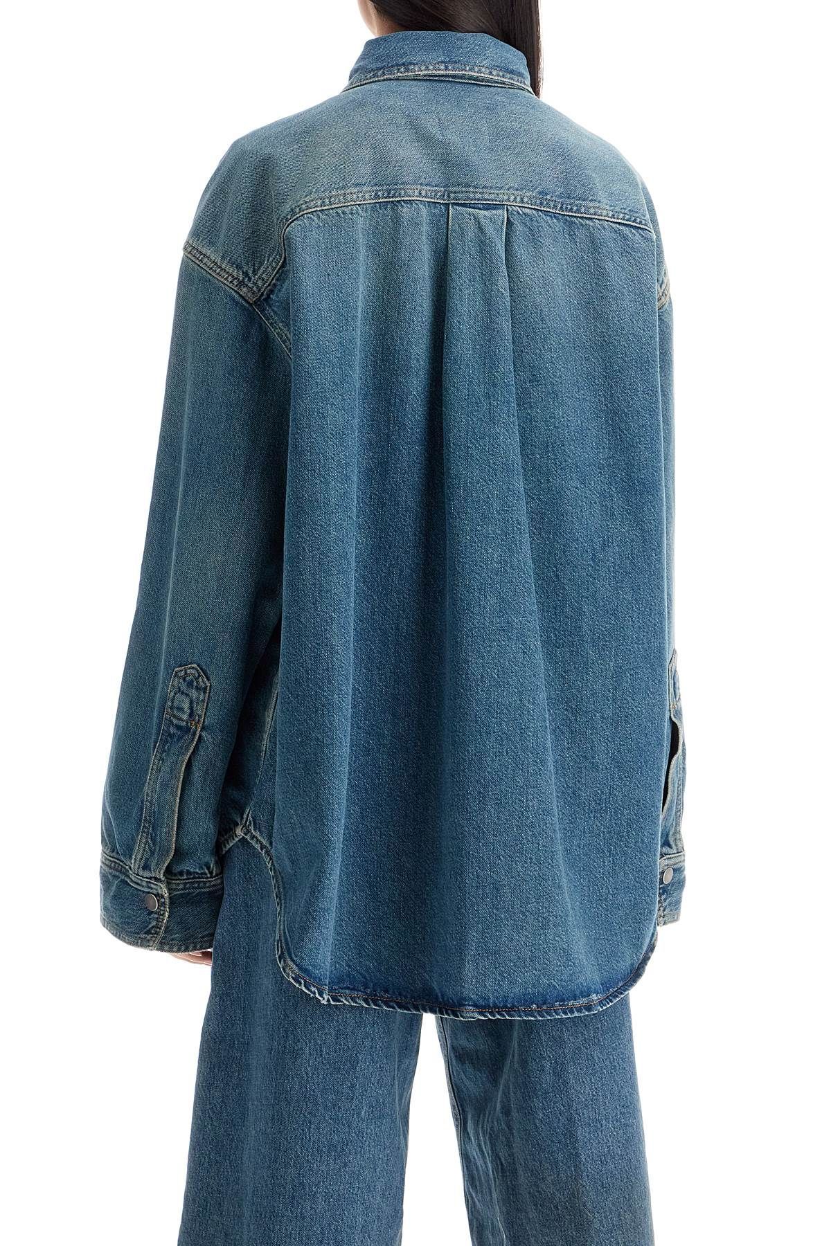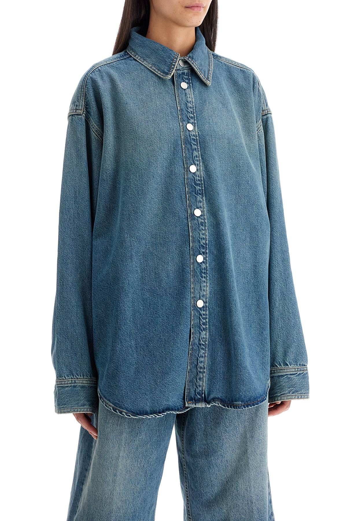 This oversized Haikure shirt is made of a cotton blend denim with a classic collar, snap button closure, and rounded hem