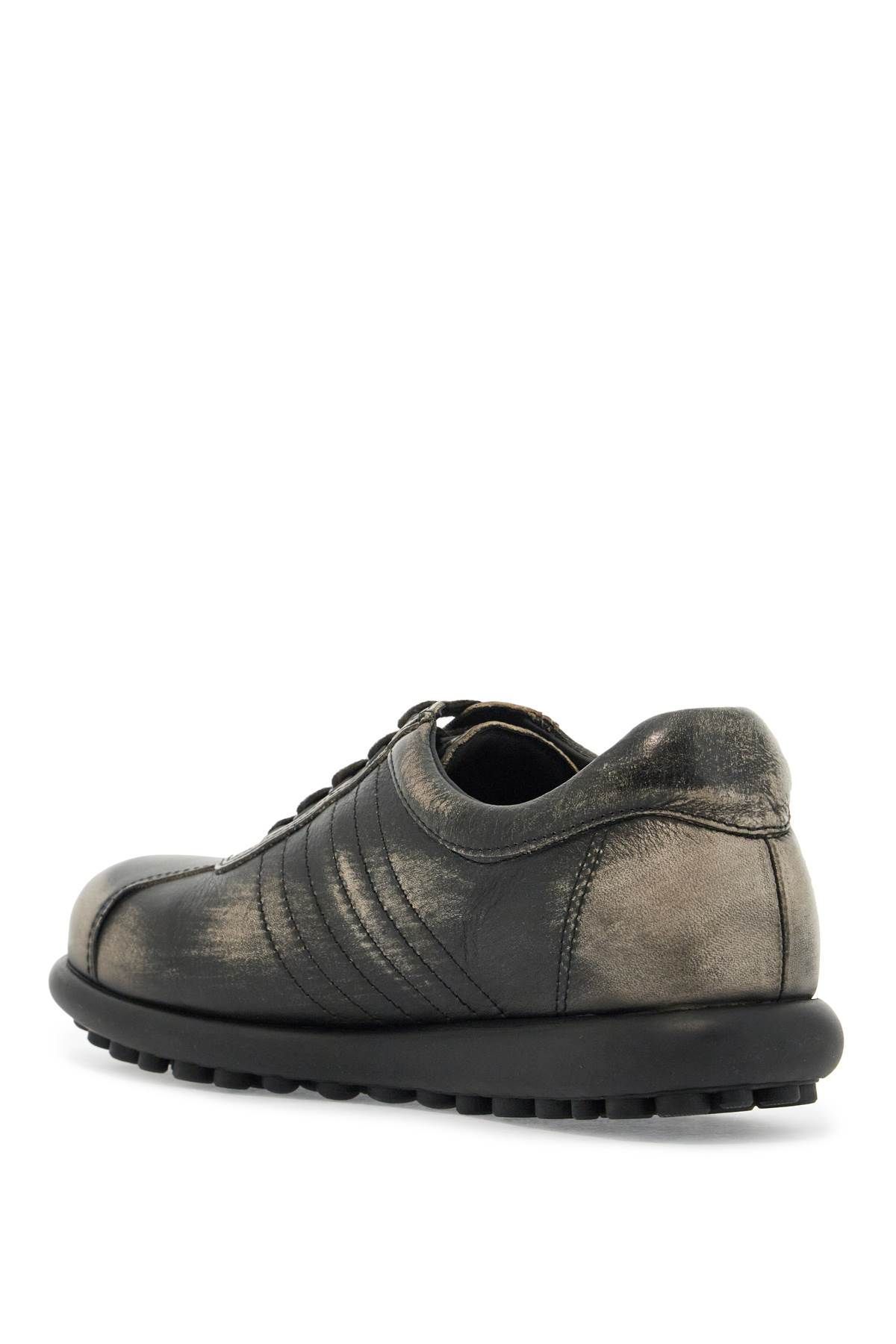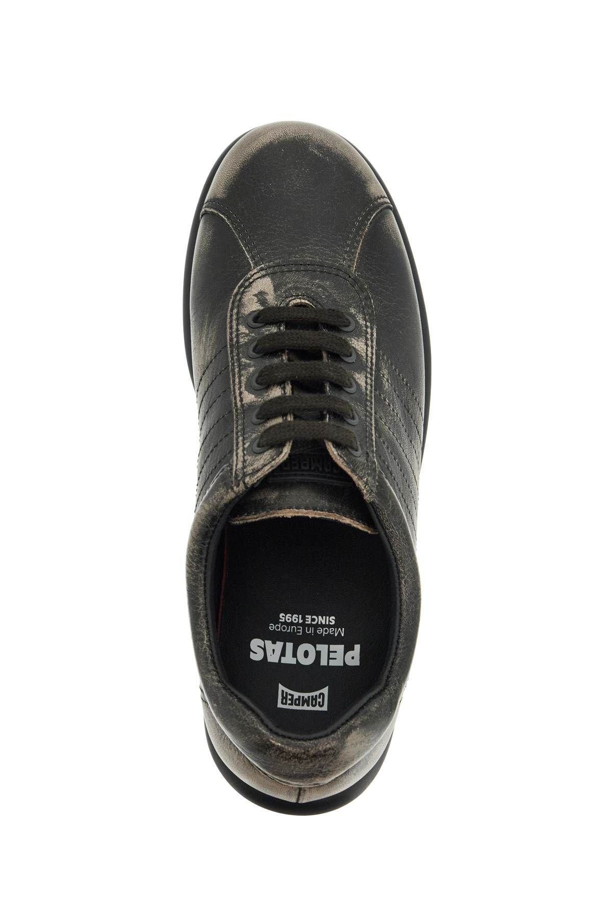 The Pelotas sneakers by Camper are made of distressed leather with a front lacing system, slightly rounded toe, rubber patch on the tongue, leather lining with removable insole, and rubber sole with small studs