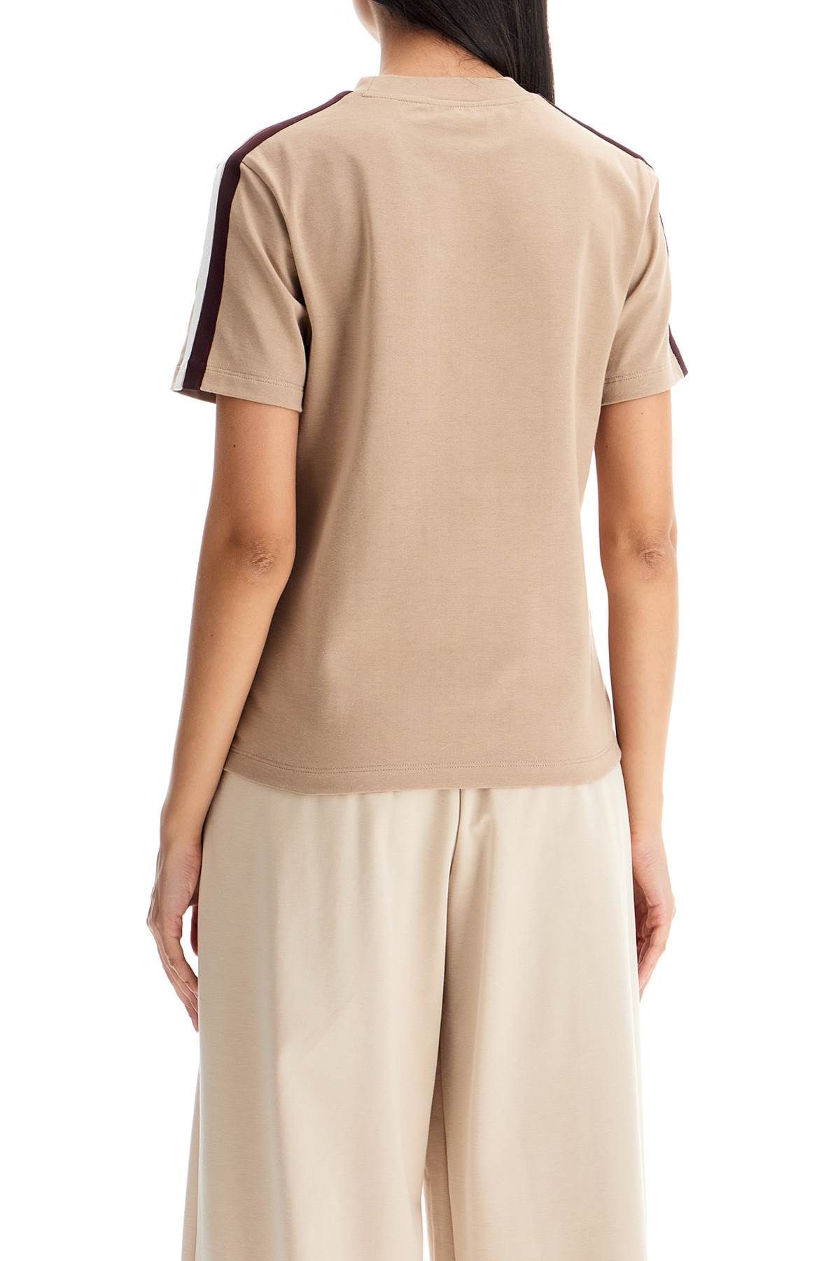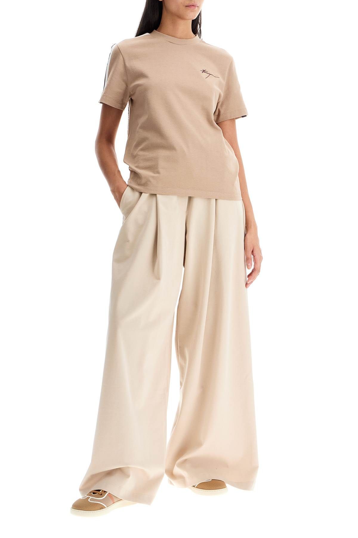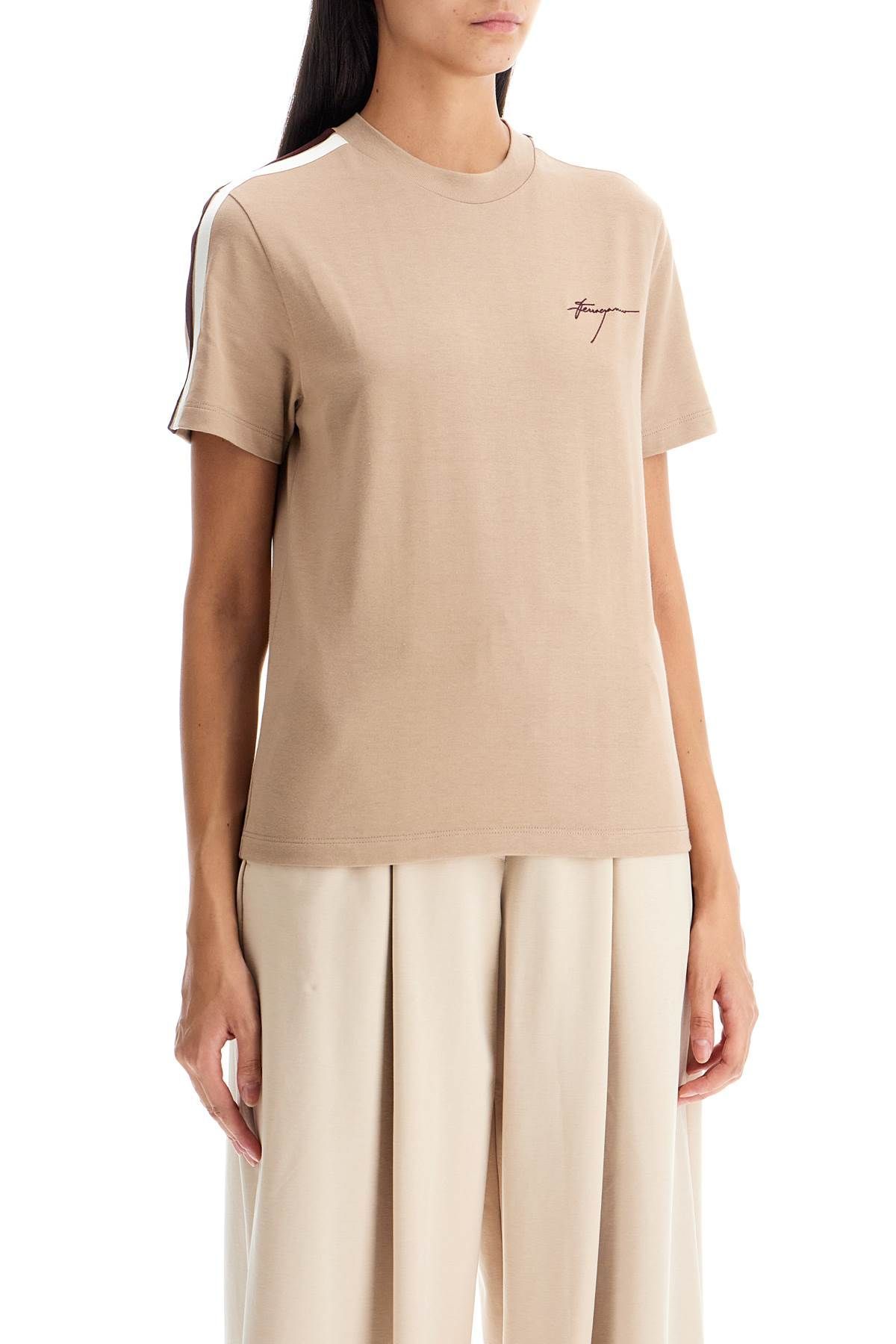 This crew neck t-shirt is made of pure cotton jersey and features the embroidered Ferragamo signature on the chest, as well as bicolor bands applied along the shoulders and sleeves