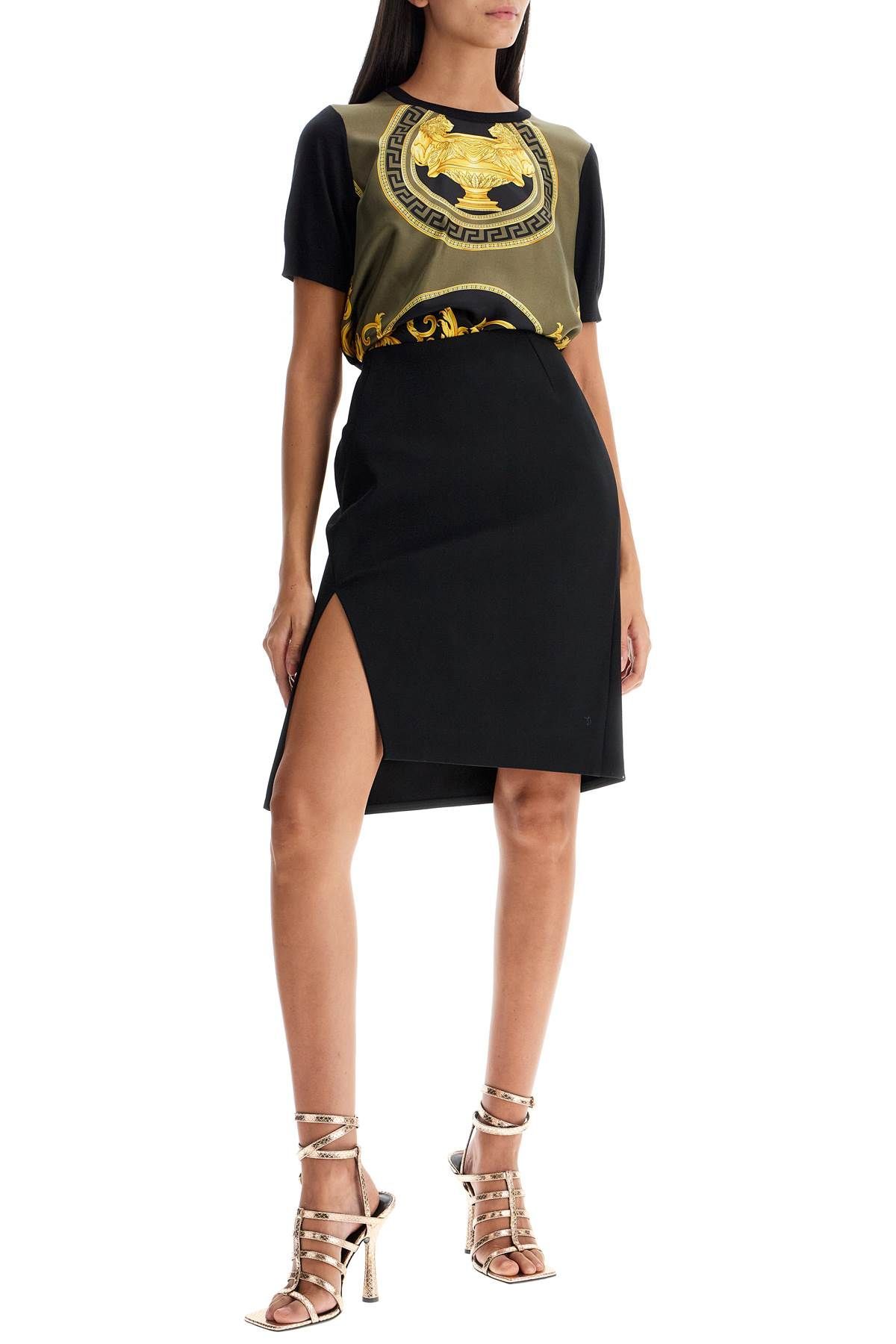 This Versace crew neck t-shirt is made of lightweight pure virgin wool with a front panel in silk twill featuring the 'La Coupe des Dieux' print
