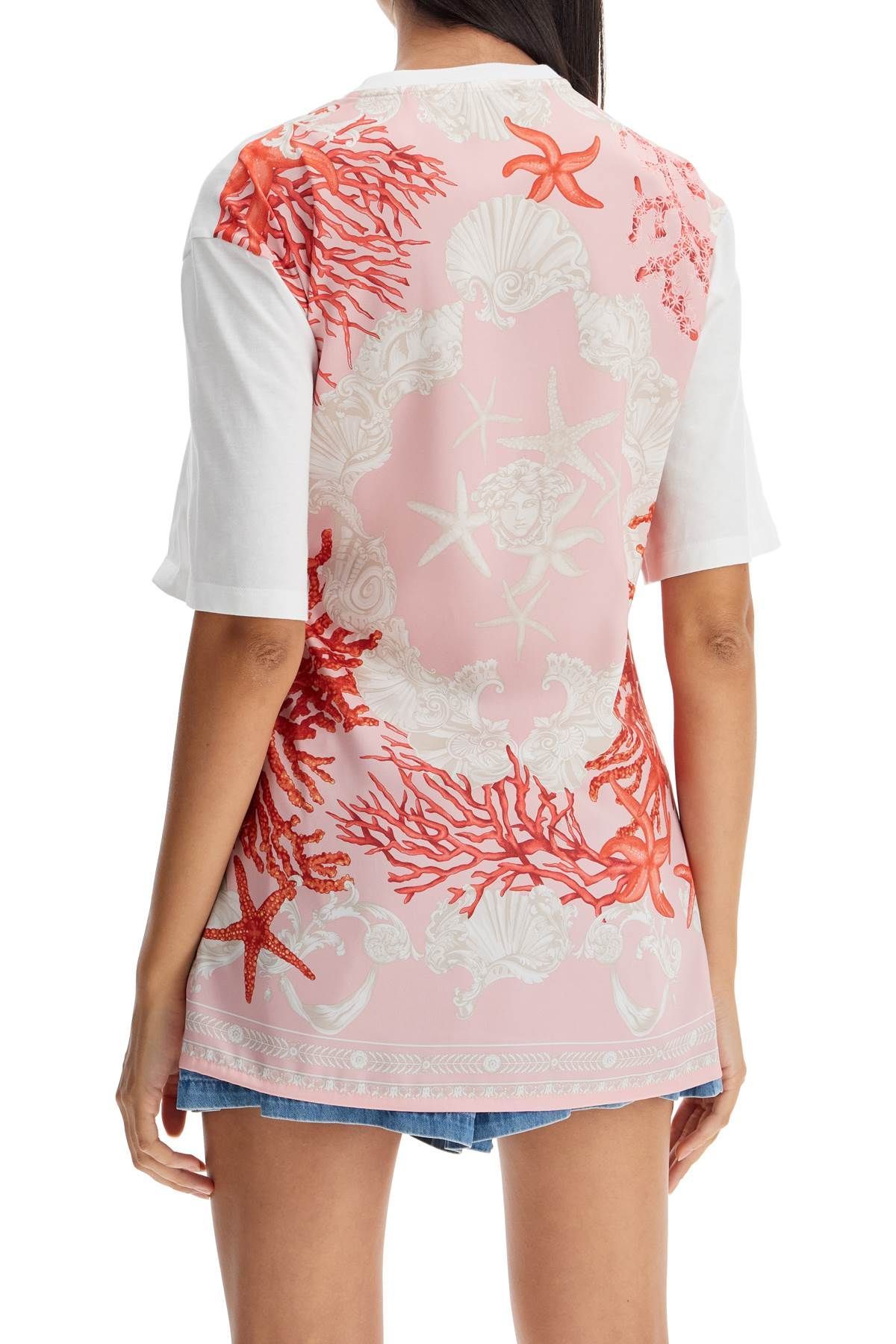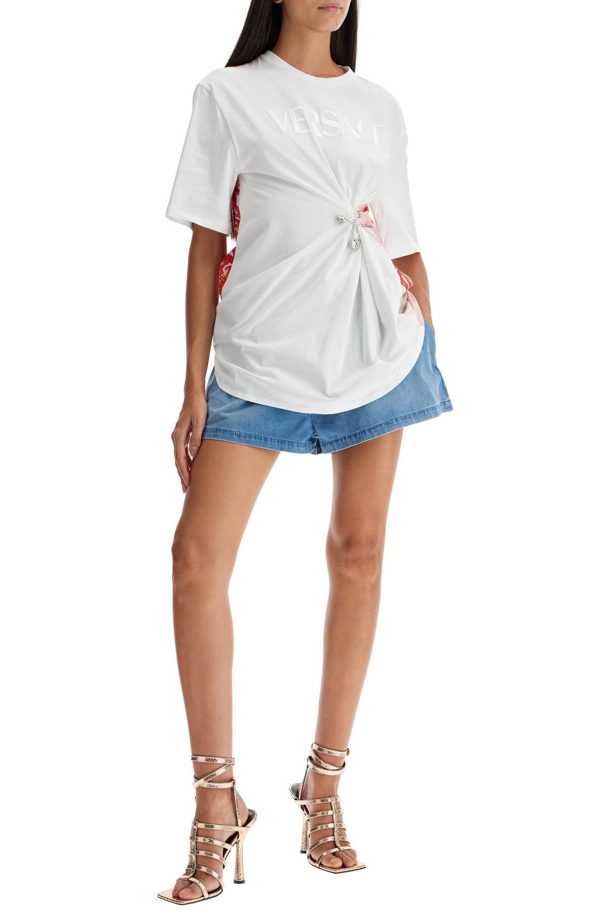 This Versace crew neck t-shirt is made of oversized cotton jersey, featuring a back panel in lightweight twill with a Barocco Sea print gathered at the front with two silver metal Safety Pins that define the waistline