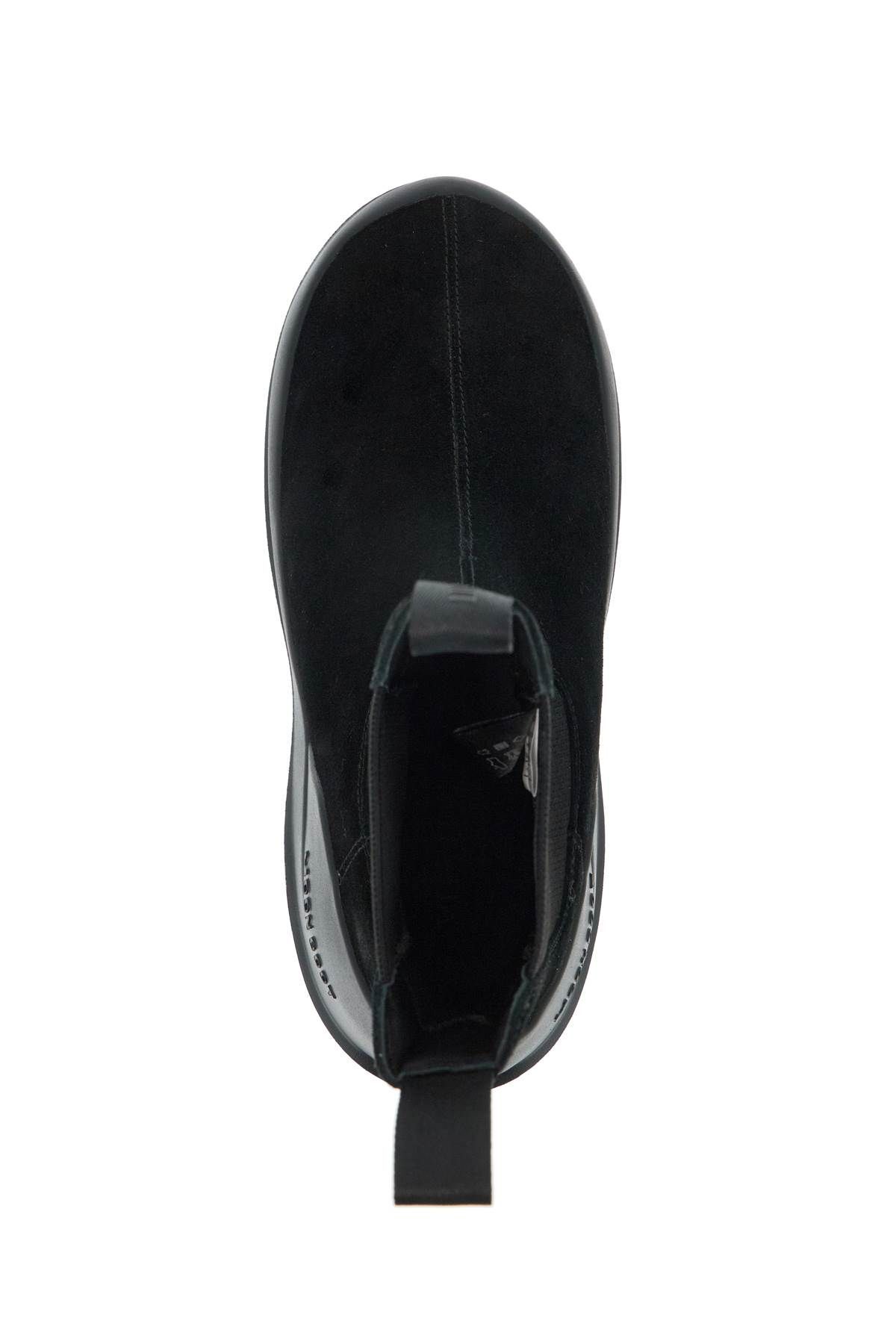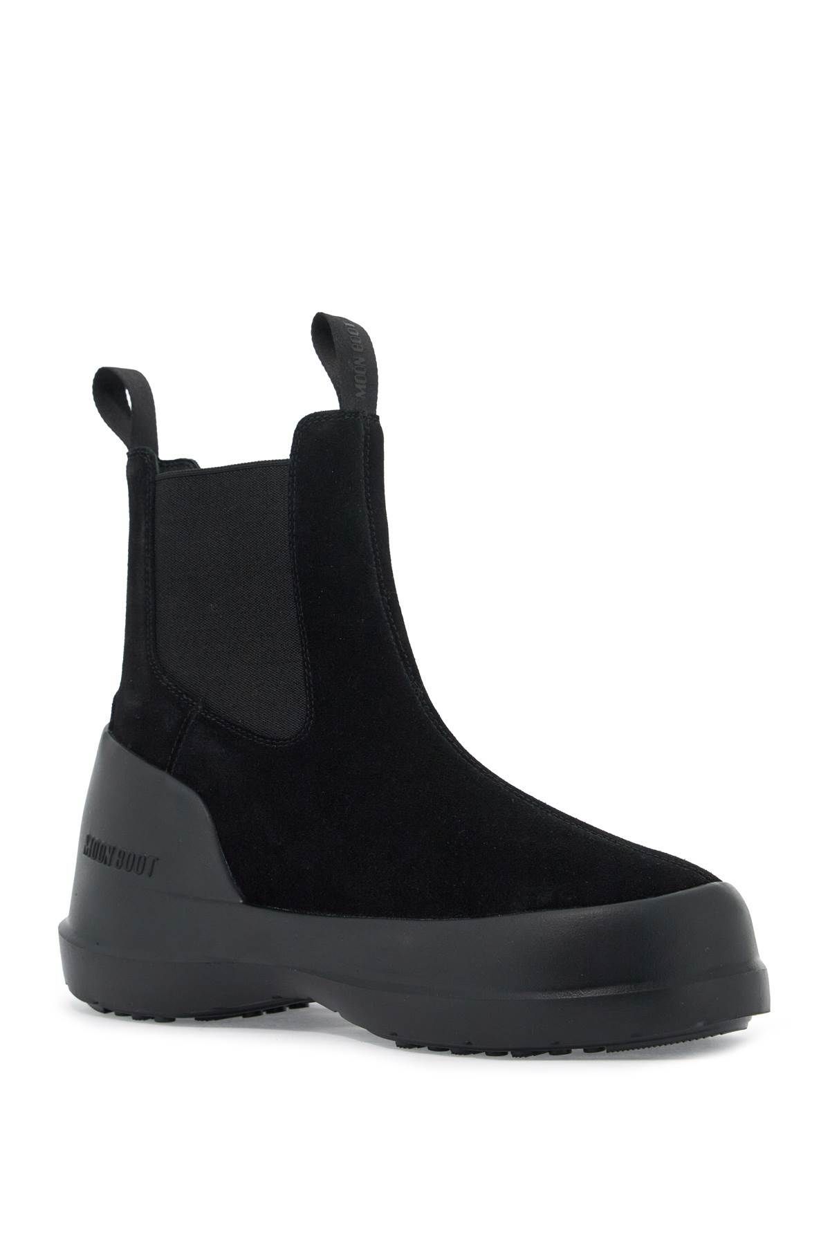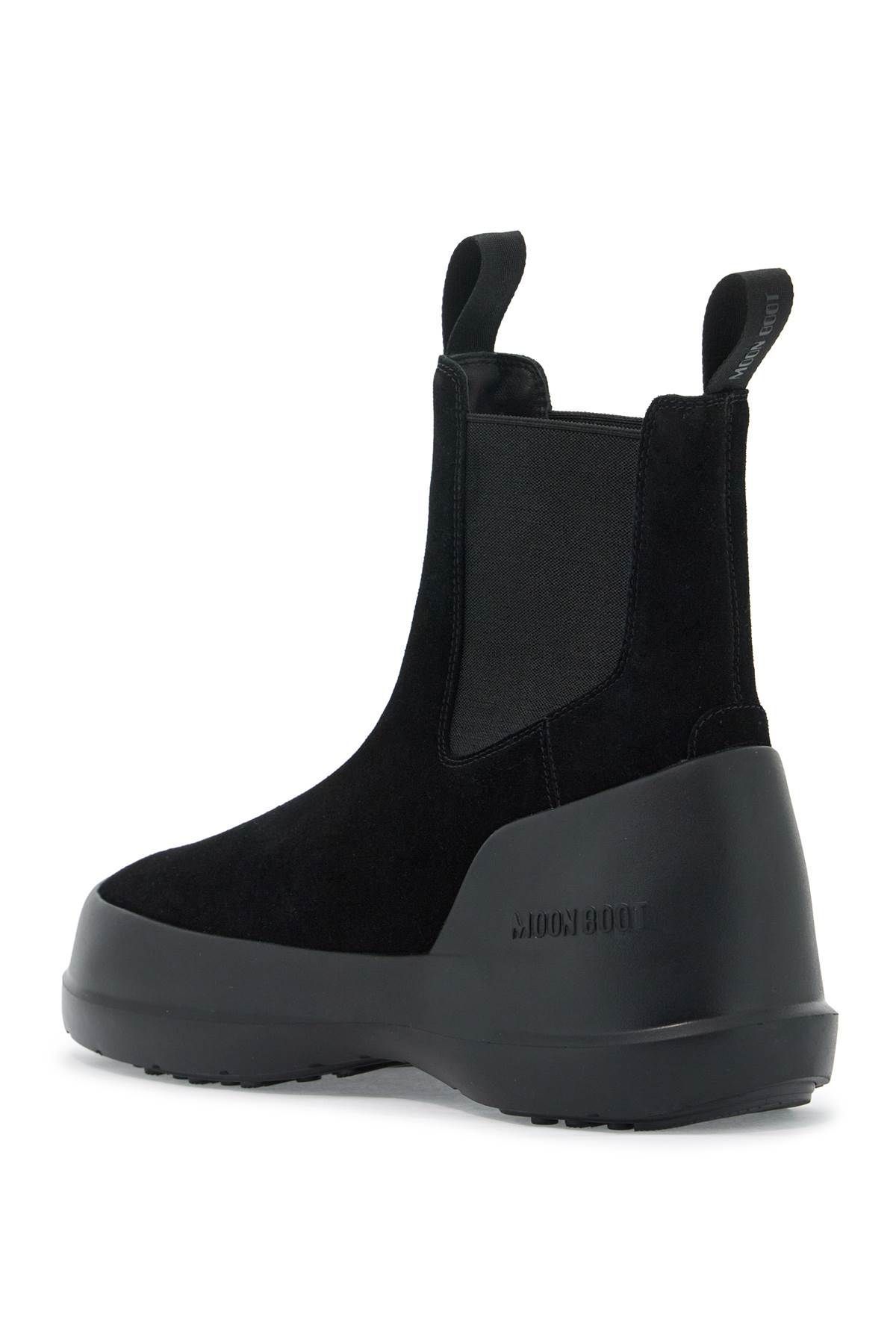 The Luna Chelsea ankle boots by Moon Boot have a minimal design and are made of suede leather with an oversized rubber sole that also covers the heel