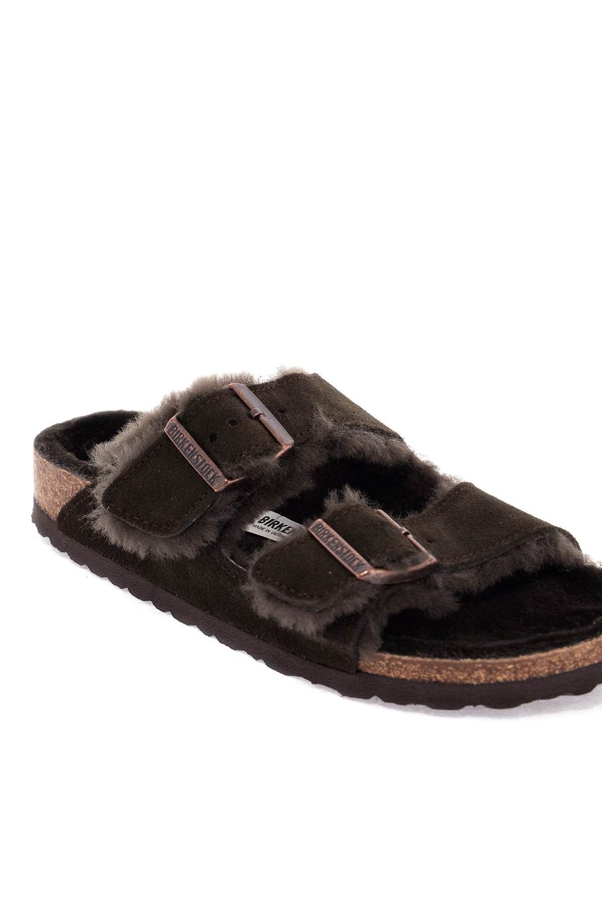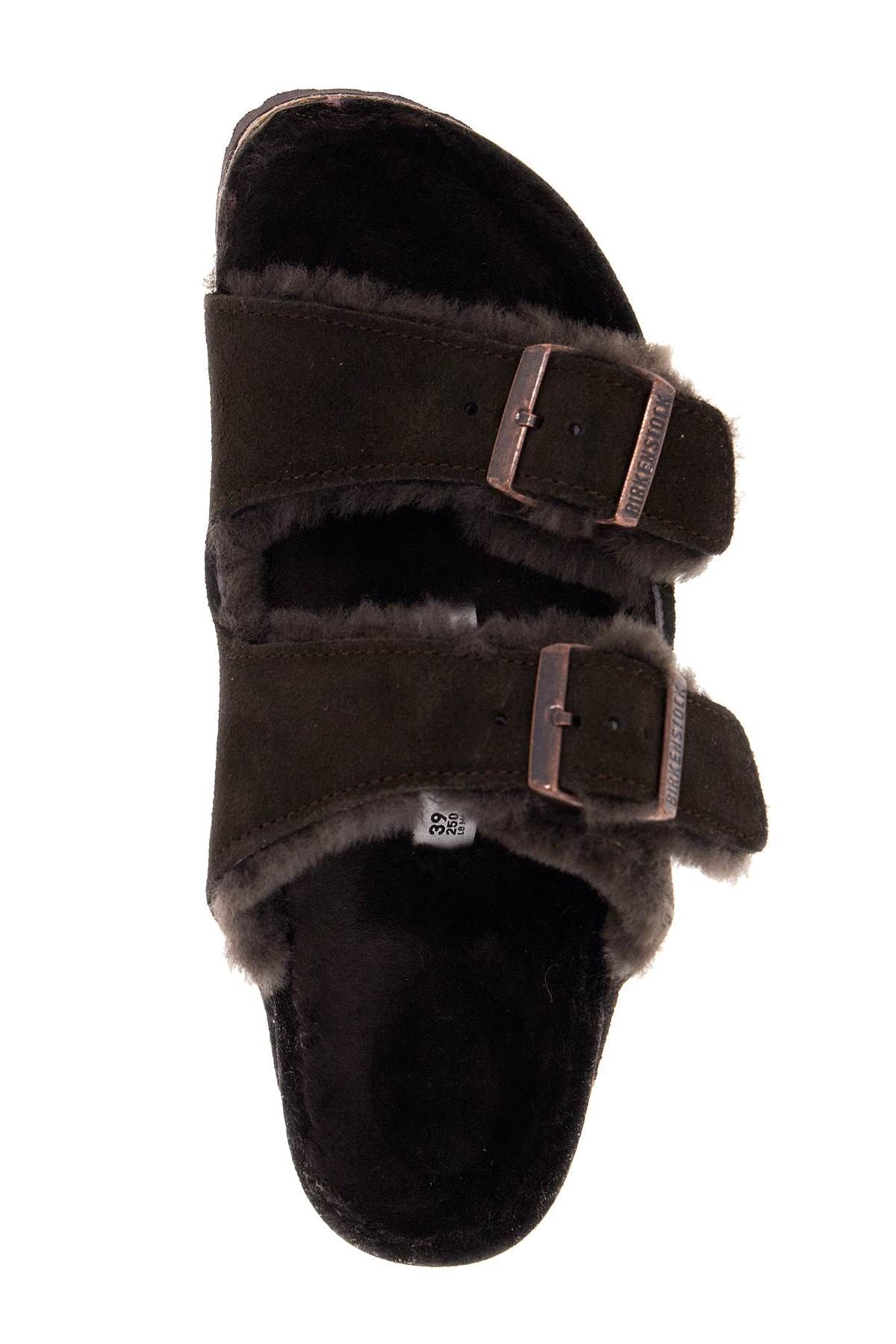 The BIRKENSTOCK Arizona slides are made of suede leather with a lining of sheepskin
