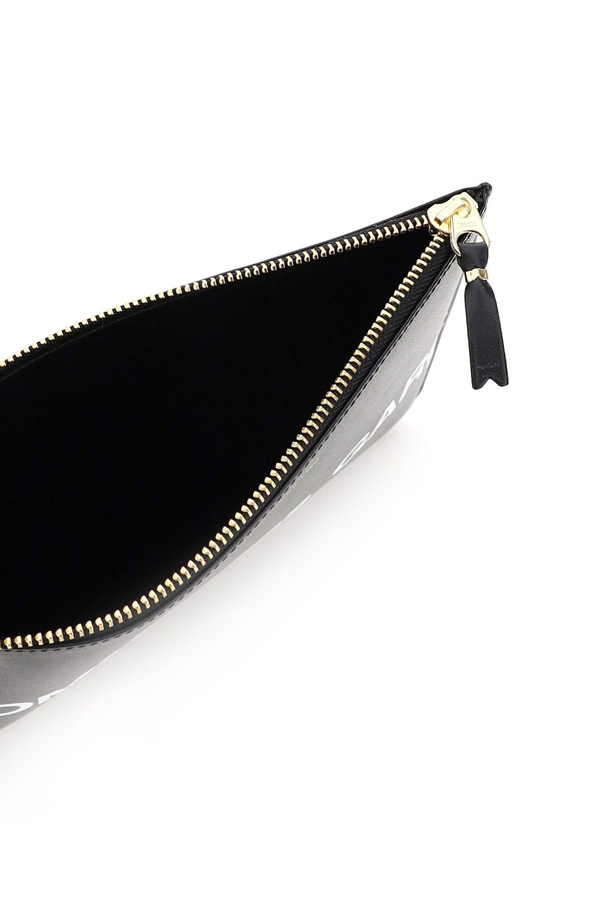 The Comme des Garcons smooth leather pouch features a contrasting logo lettering print that extends to the back and a laminated logo