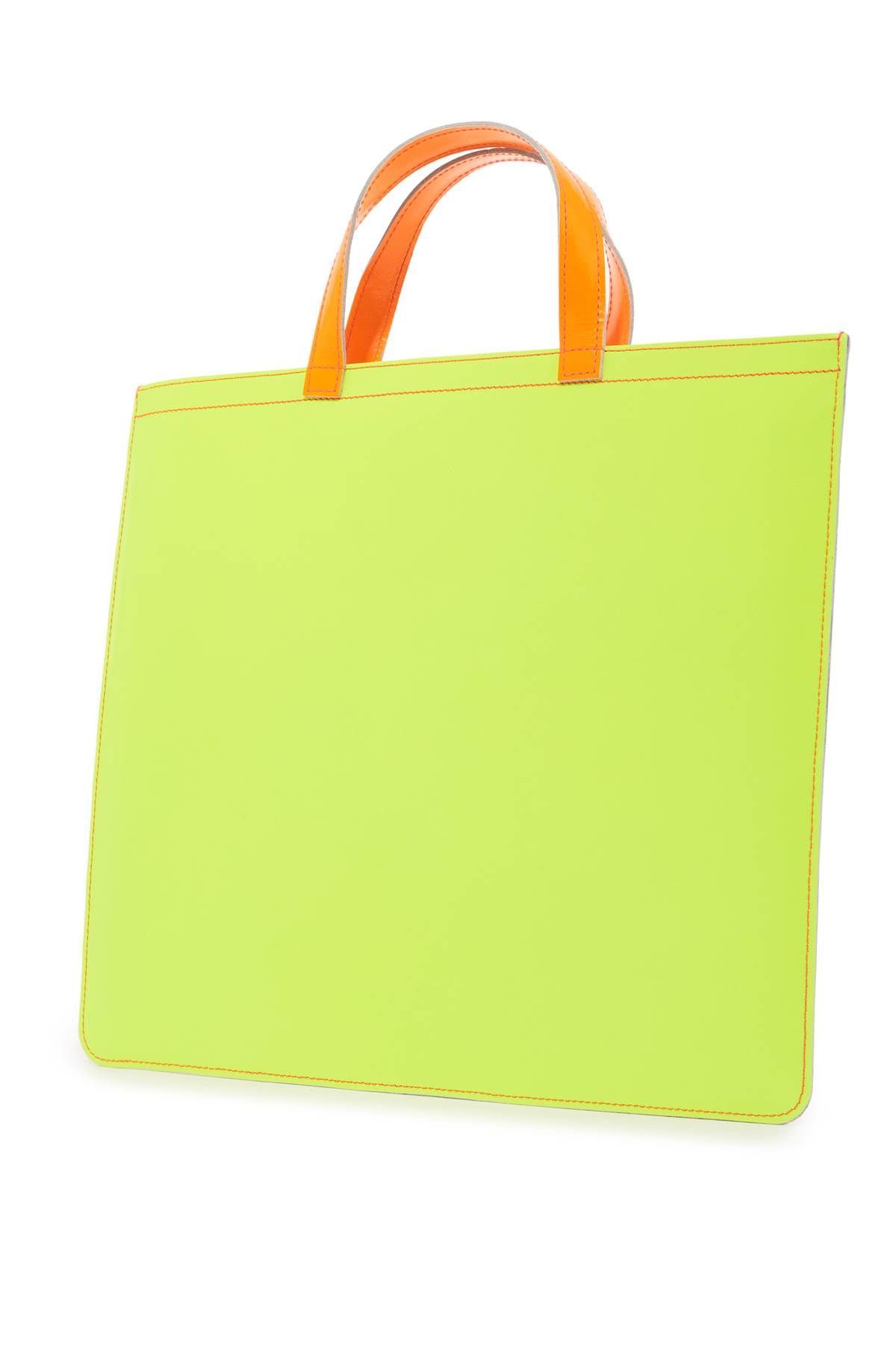 This handbag is made of COMME de GARA?ONS leather in three fluorescent colors, with a small contrasting logo lettering on the front