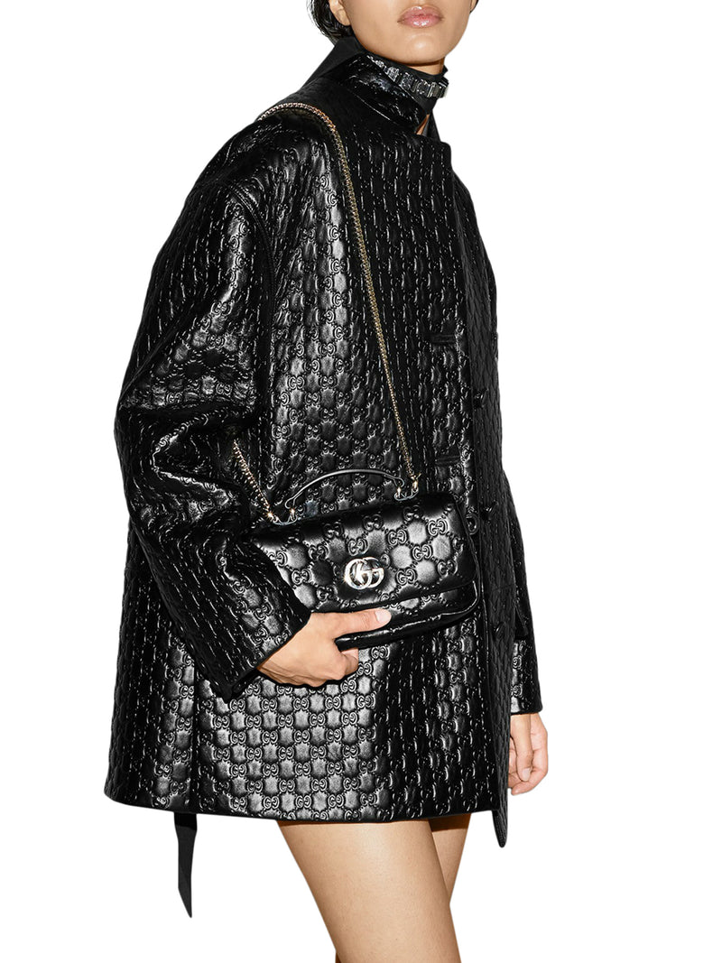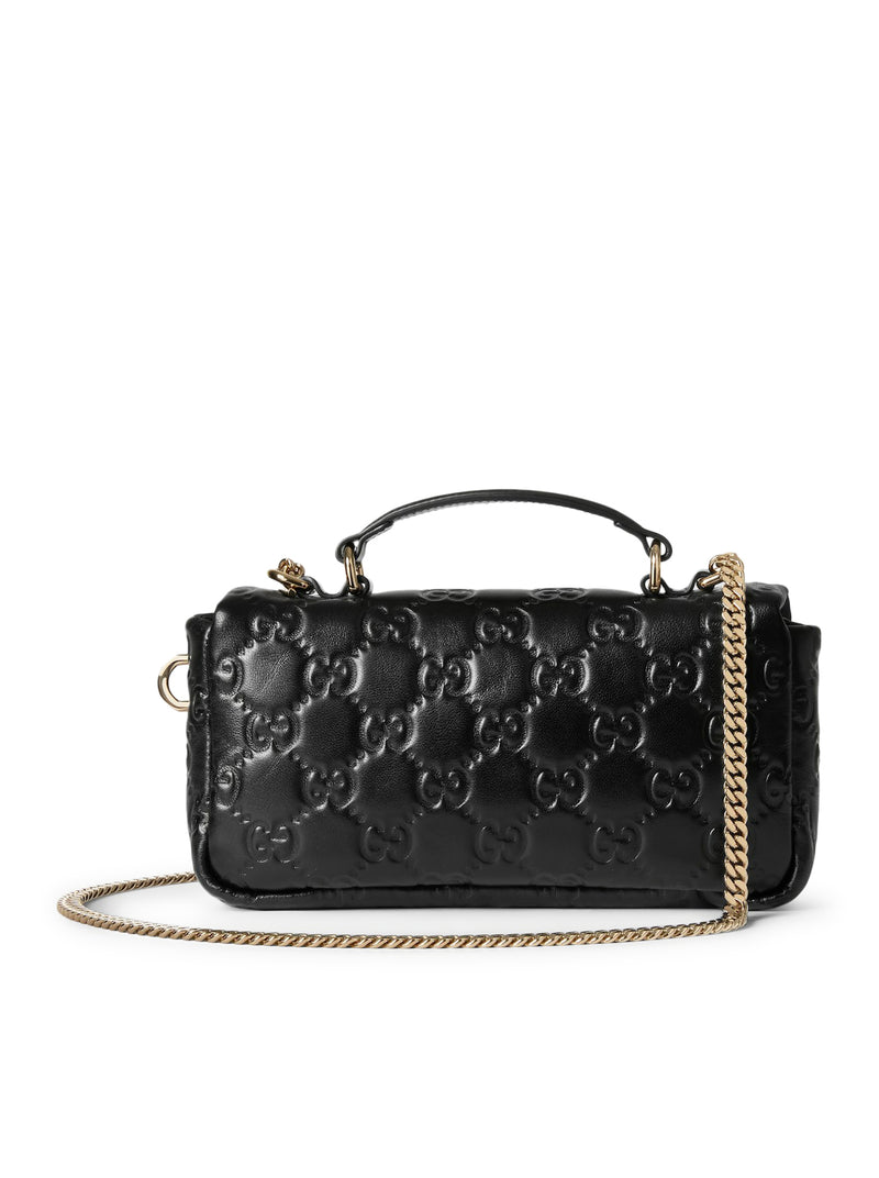 -Shiny light gold-tone hardware -Gucci Rosso Ancora leather lining -Double G -D-rings -1 zip pocket with GG charm, 1 open pocket and 1 lipstick compartment -Handle, drop 6.1 cm -Removable chain shoulder strap, drop 50 cm -Spring closure -Mini size: L 21.1 cm x H 12.4 cm x D 4.6 cm -Weight: approximately 0.499 kg