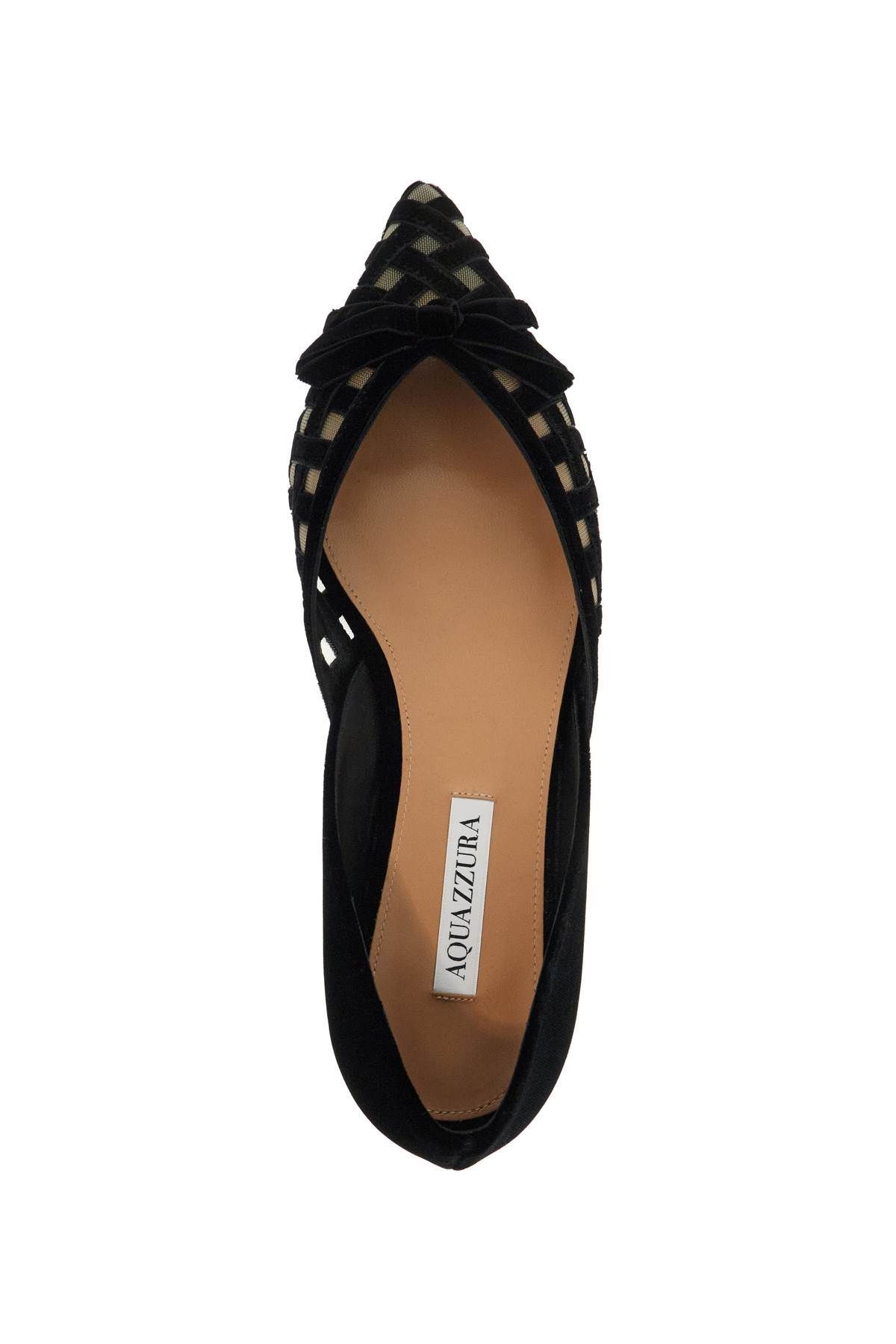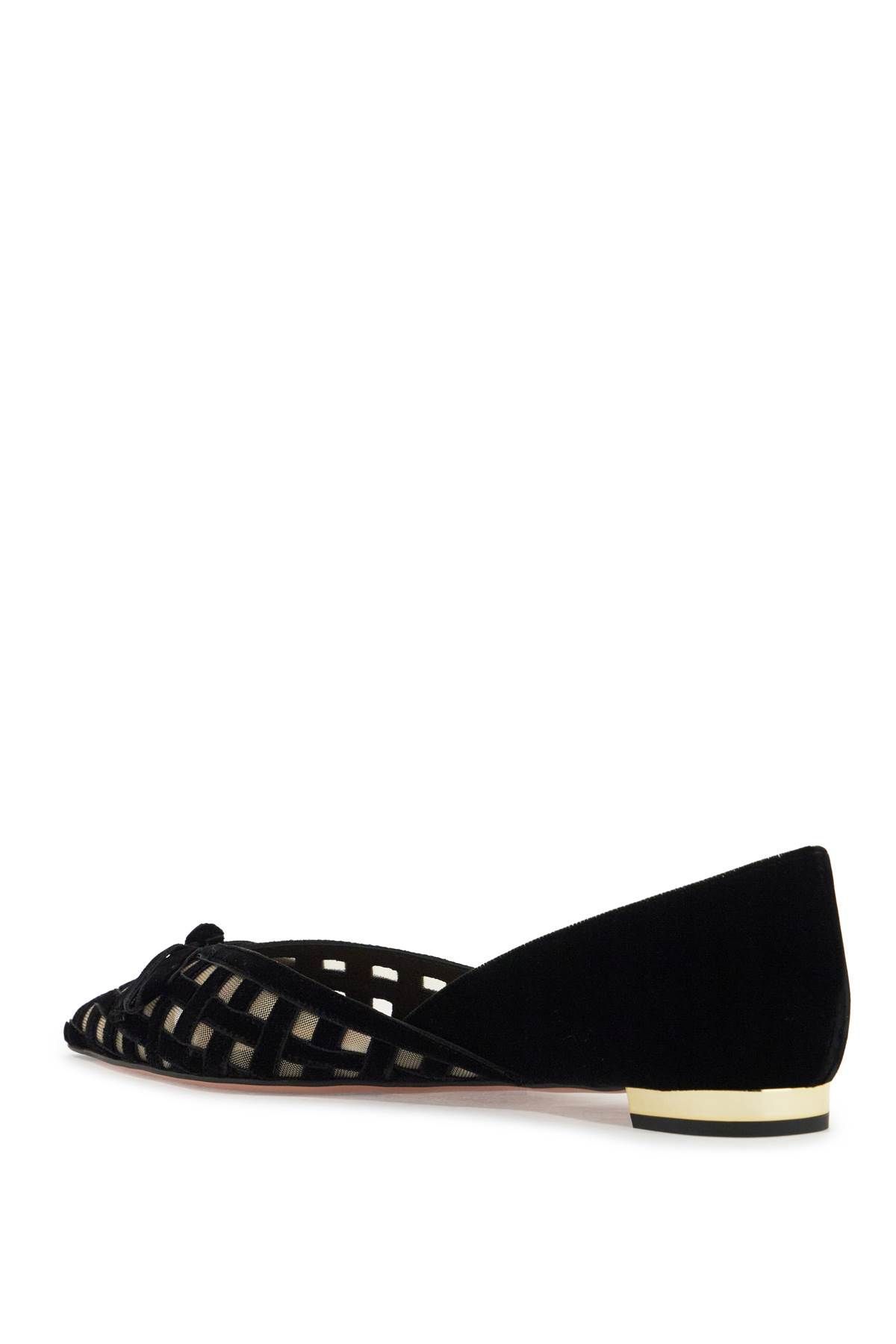 The Aquazzura Romance ballerina flats are made of velvet and feature a two-panel construction, with the front panel showcasing a cage design on a mesh base and a tonal decorative bow