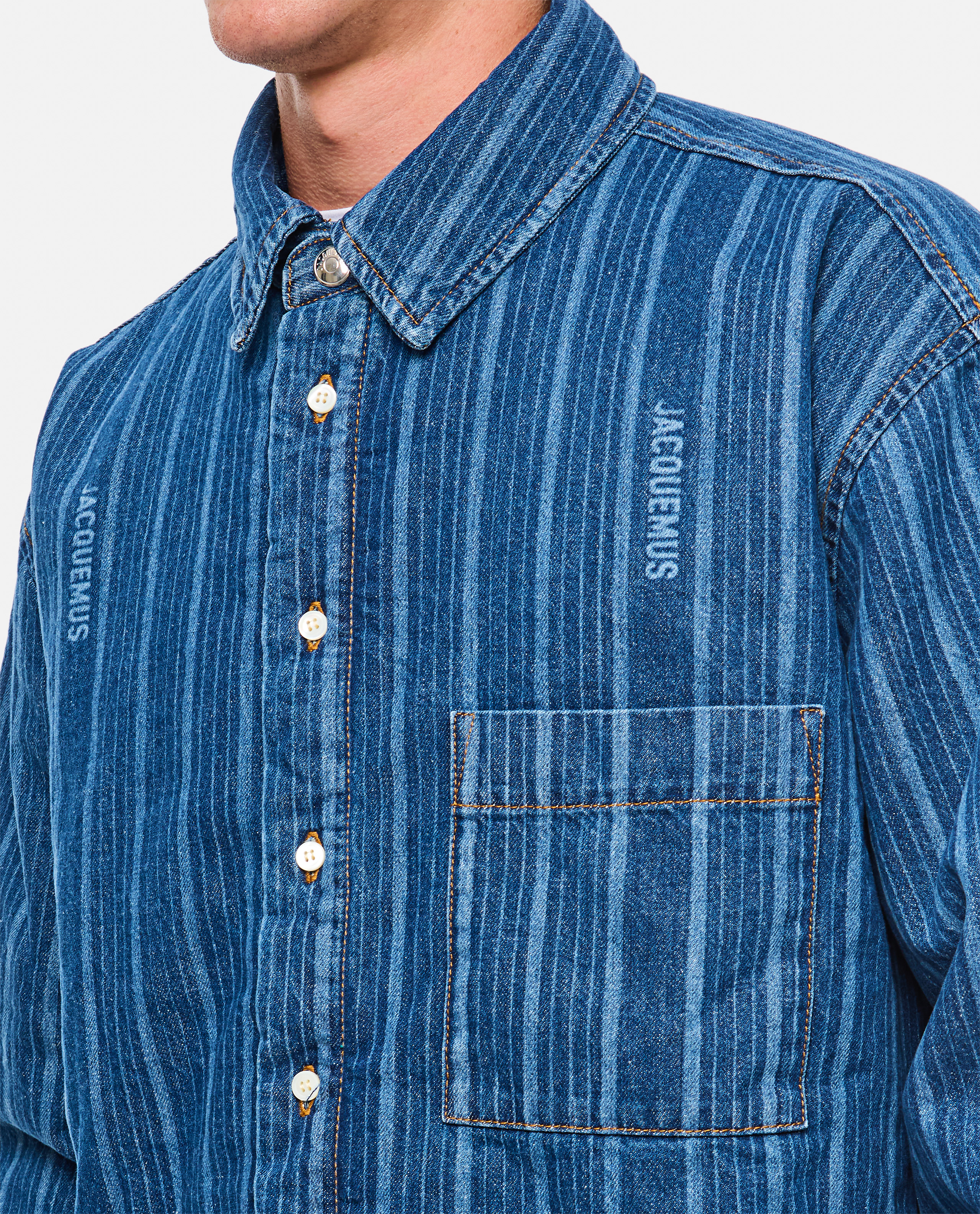 Striped cotton.Pointed collar.Chest pocket with embroidered logo.Classic button tab and buttoned cuffs.Color: blue.