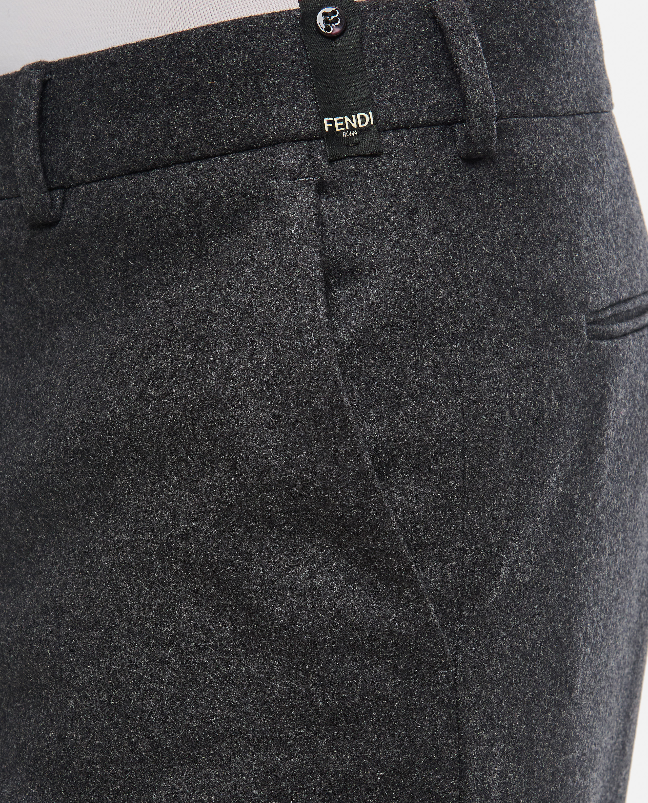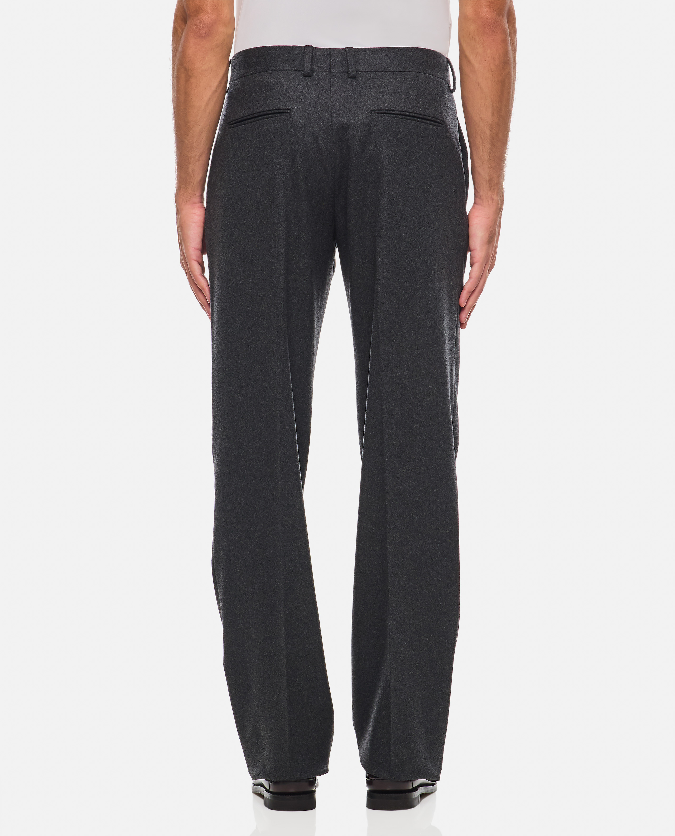 Straight-fit trousers with belt loops at the waist. Side pockets. Pressed crease on the front and stitched crease on the back. Covered zip closure. Color: grey.
