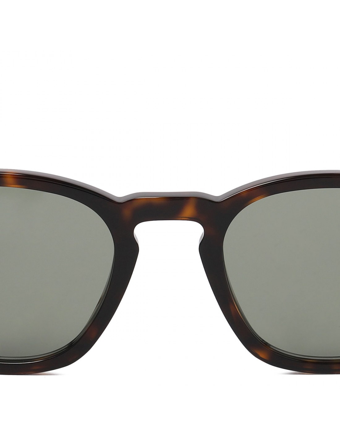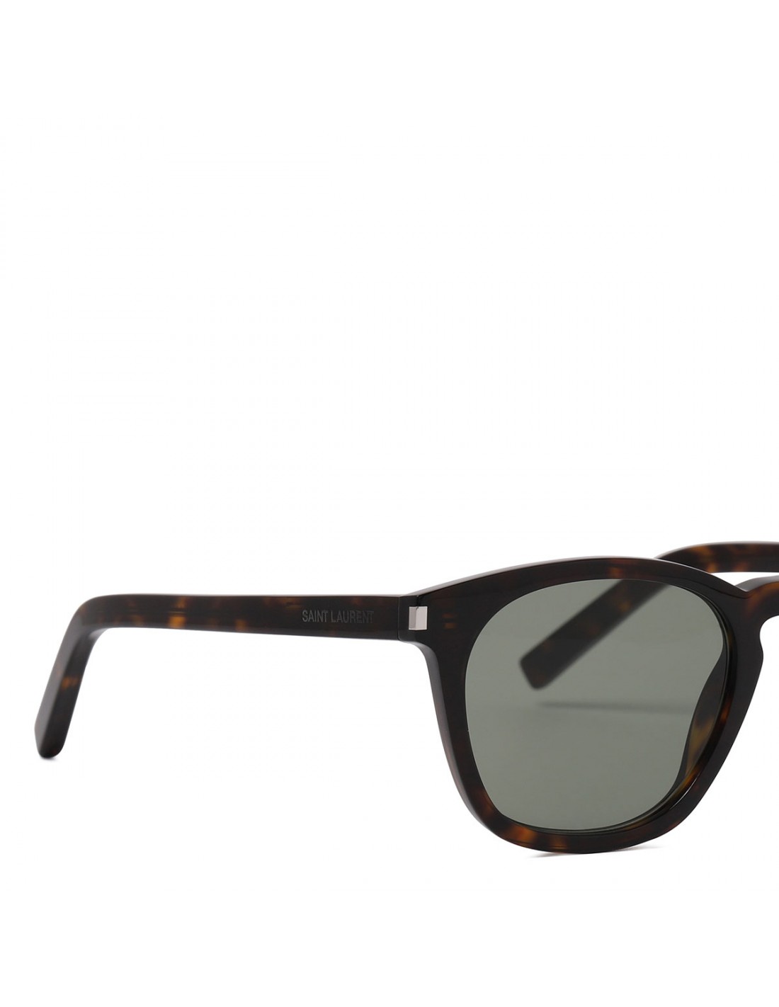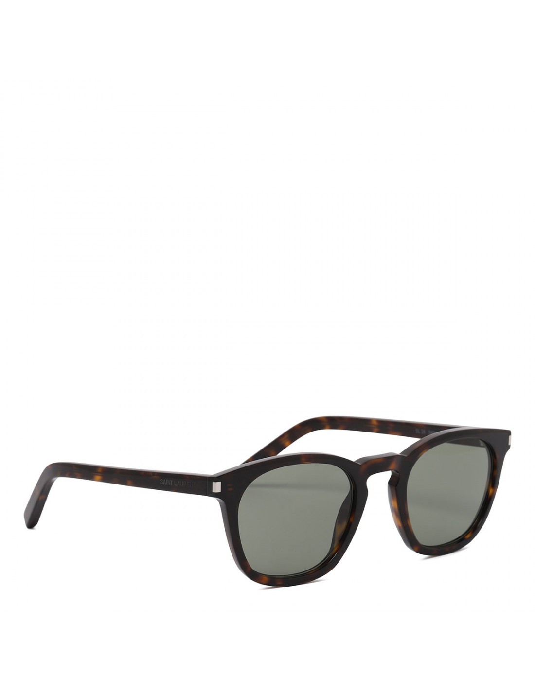 Dark havana tortoiseshell acetate Classic SL 28 sunglasses from Saint Laurent featuring keyhole bridge, metal corner angles, logo engraved temples, green mineral glass lenses with 100% UVA/UVB protection.
