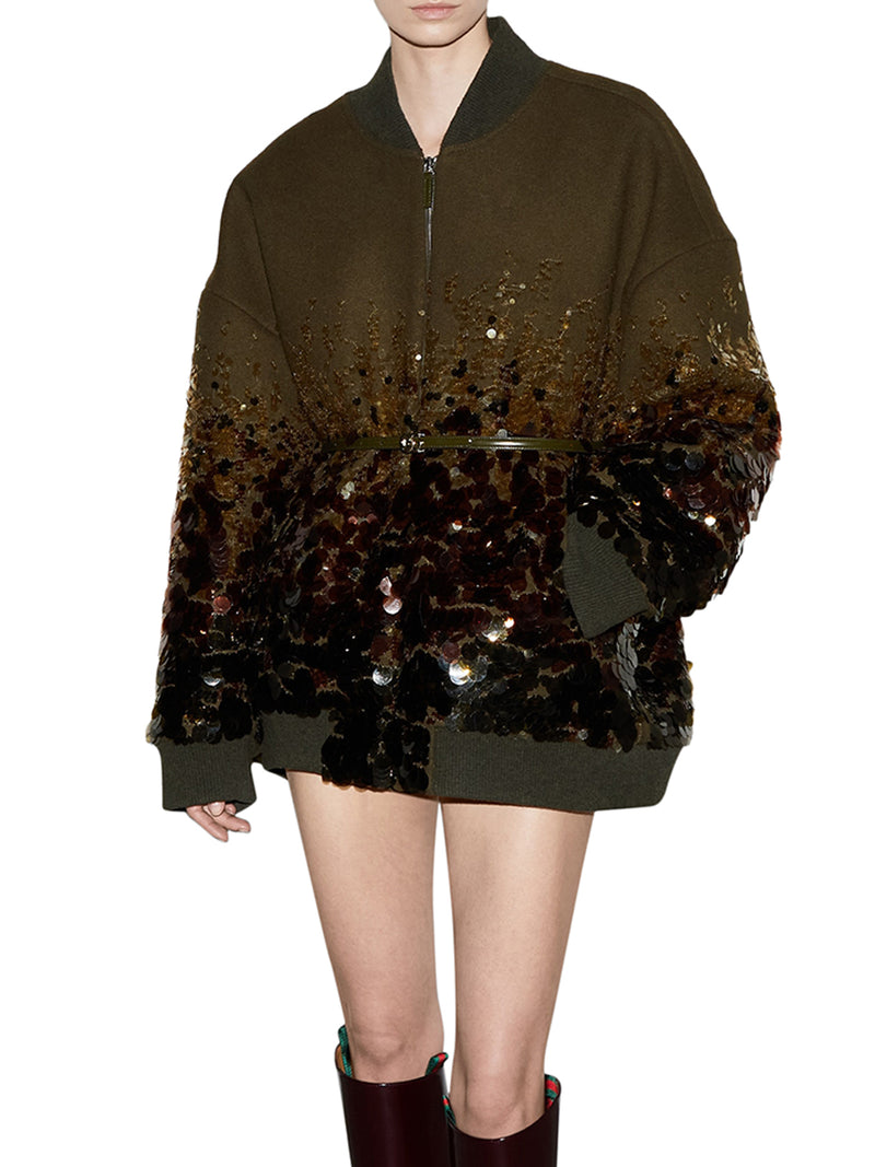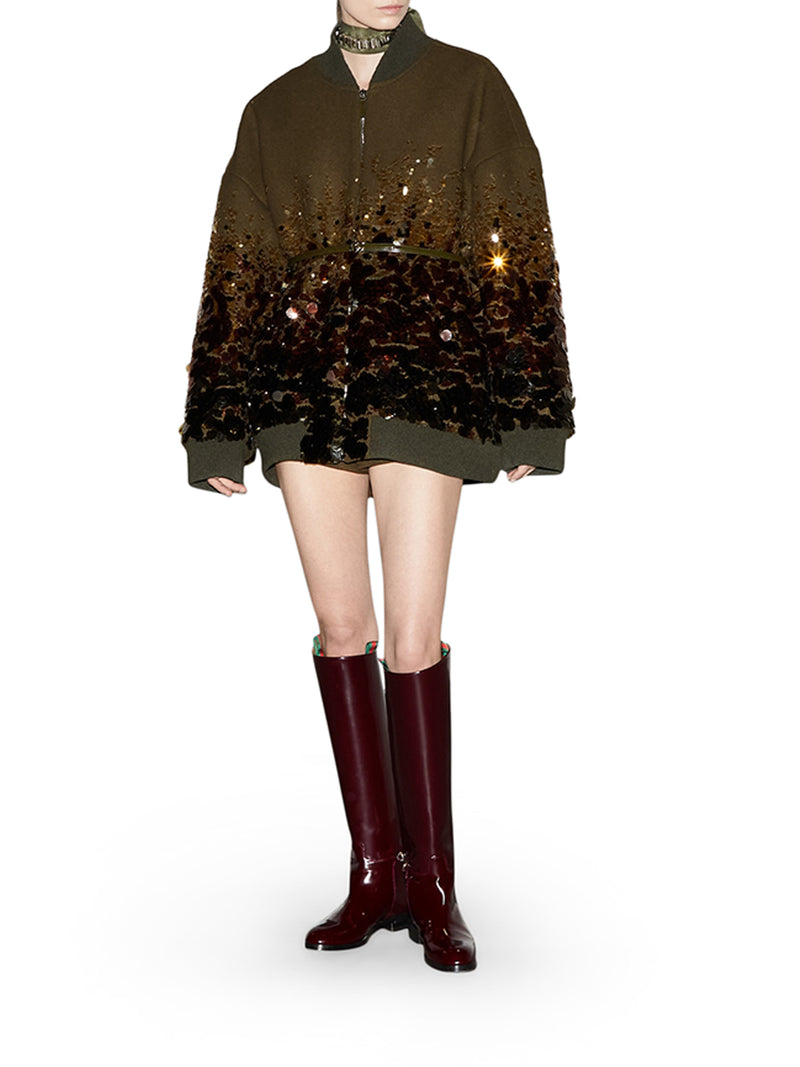 -Olive green Batavia wool -Multi-dimensional sequin embroidery with a shaded effect -Quilted lining -Stand collar -Round GG crossover -Drop shoulders -Cut back -Detachable leather belt with Double G buckle -Two side pockets -Ribbed trims -Zip fastening