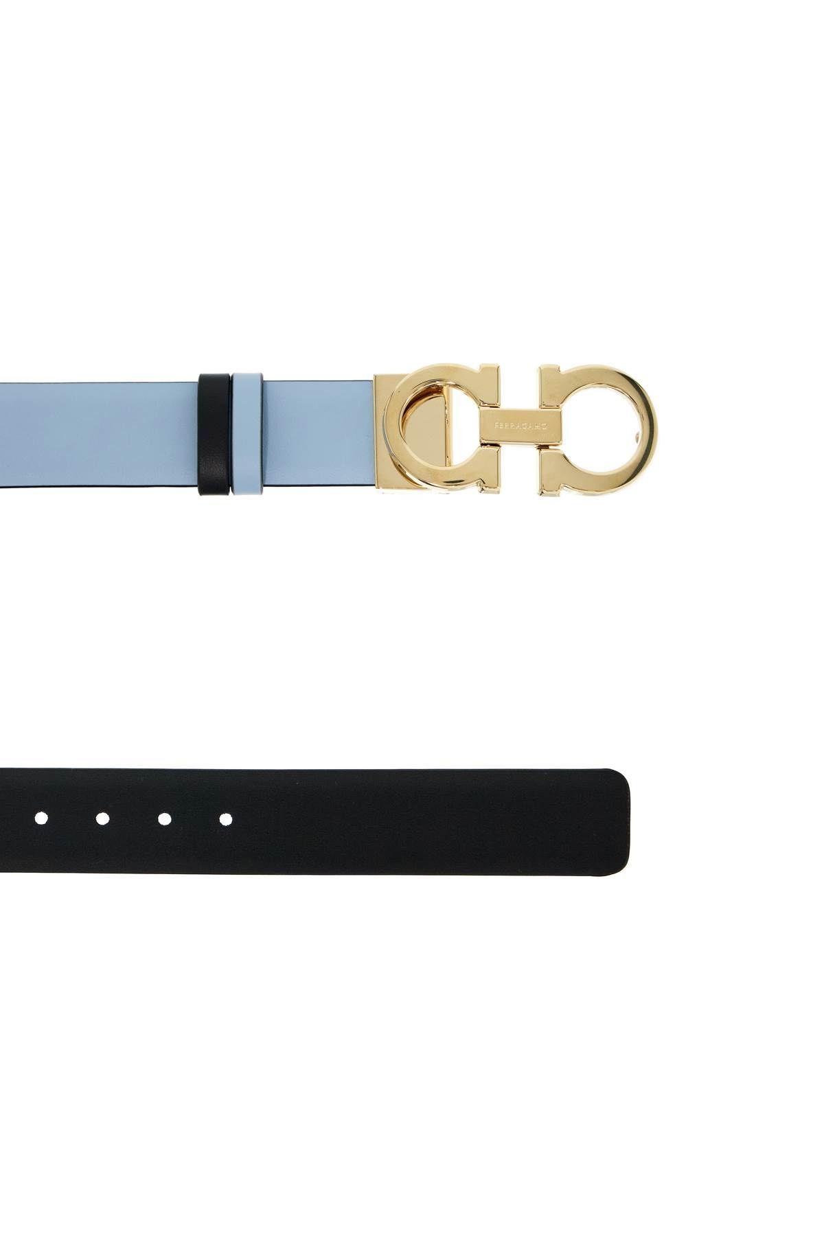 Reversible FERRAGAMO belt in smooth leather with contrasting sides and iconic Gancini buckle in gold metal finish