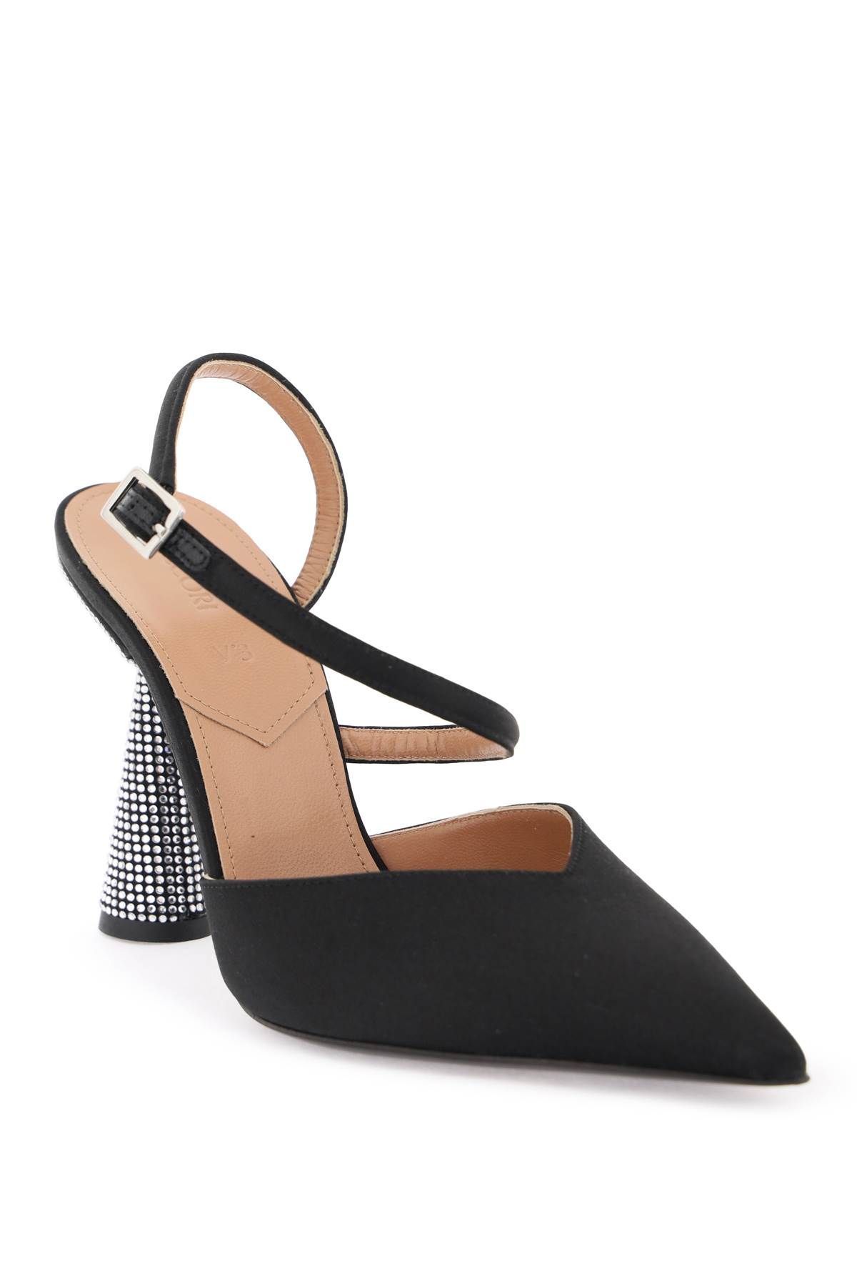 Arya pumps by D'accori made of satin and featuring an asymmetrical strap and iconic rhinestone-covered heel