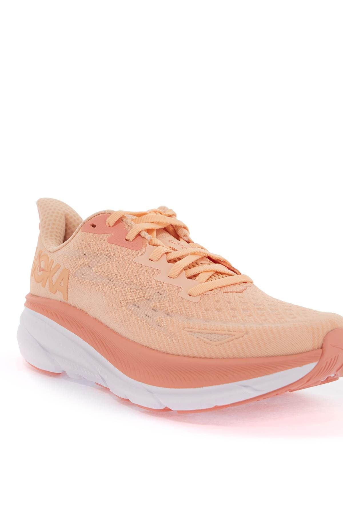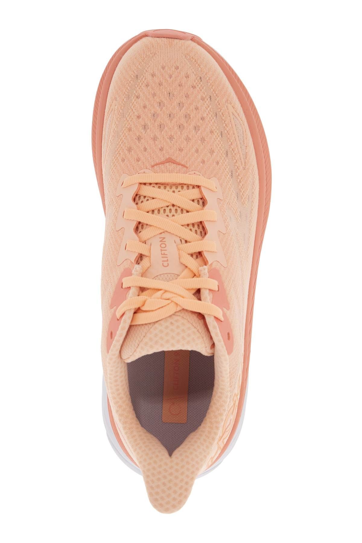 Hoka "Clifton 9" sneakers with breathable technical fabric upper, tone-on-tone lettering logo on side, lace-up closure and fabric partially lined-interior with removable insole