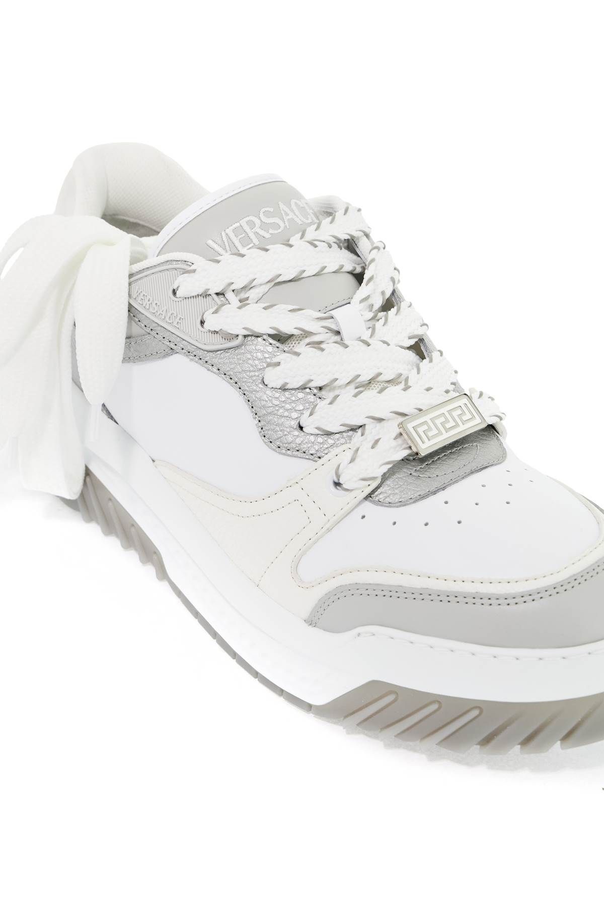 Versace's Odiessea sneakers feature a smooth leather upper with contrasting hammered leather inserts