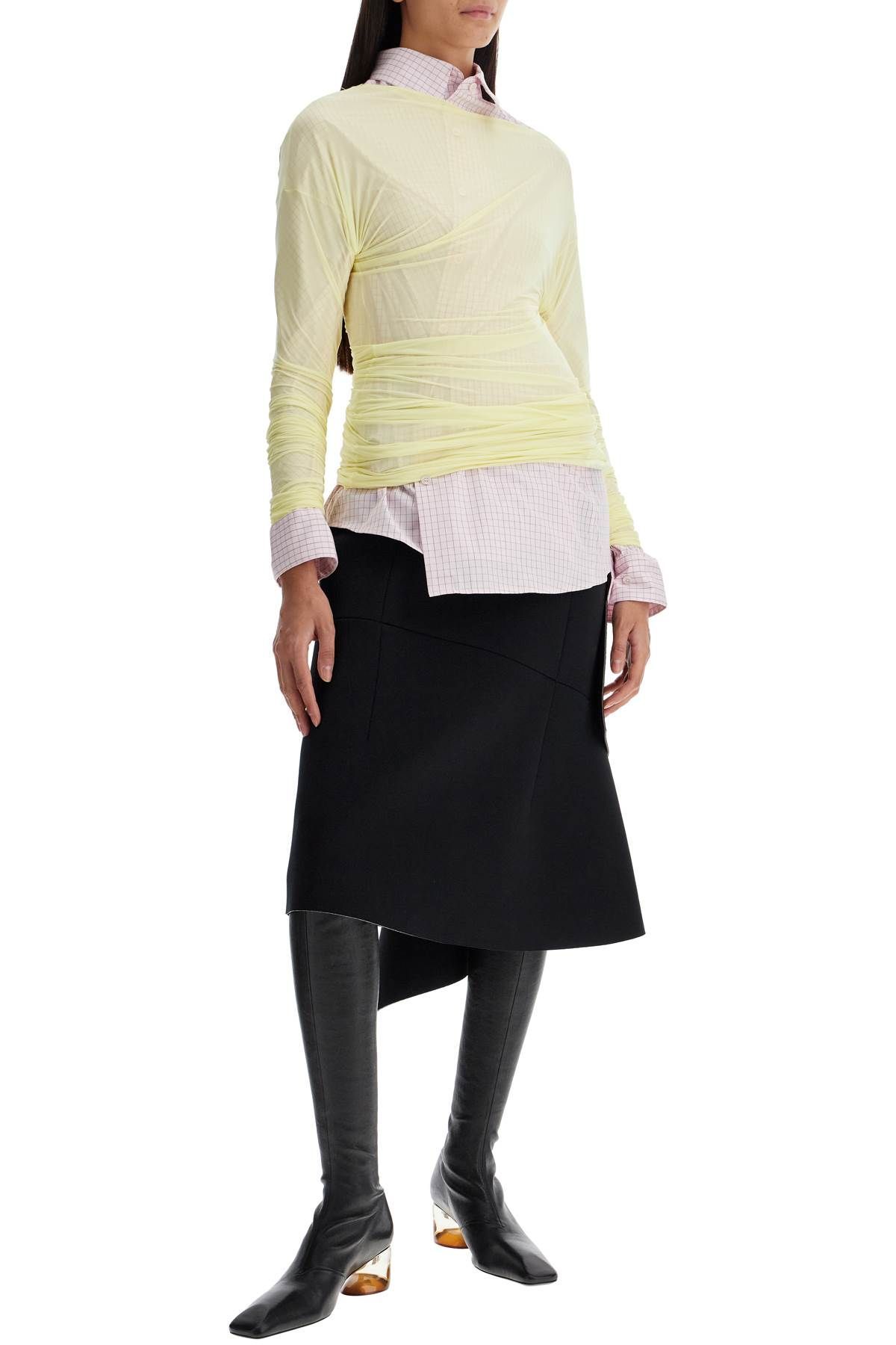 This long-sleeved top by Dries Van Noten, made of semi-transparent stretch nylon jersey with a shiny finish, features an extra-long design that can be adjusted to the desired length for a draped effect