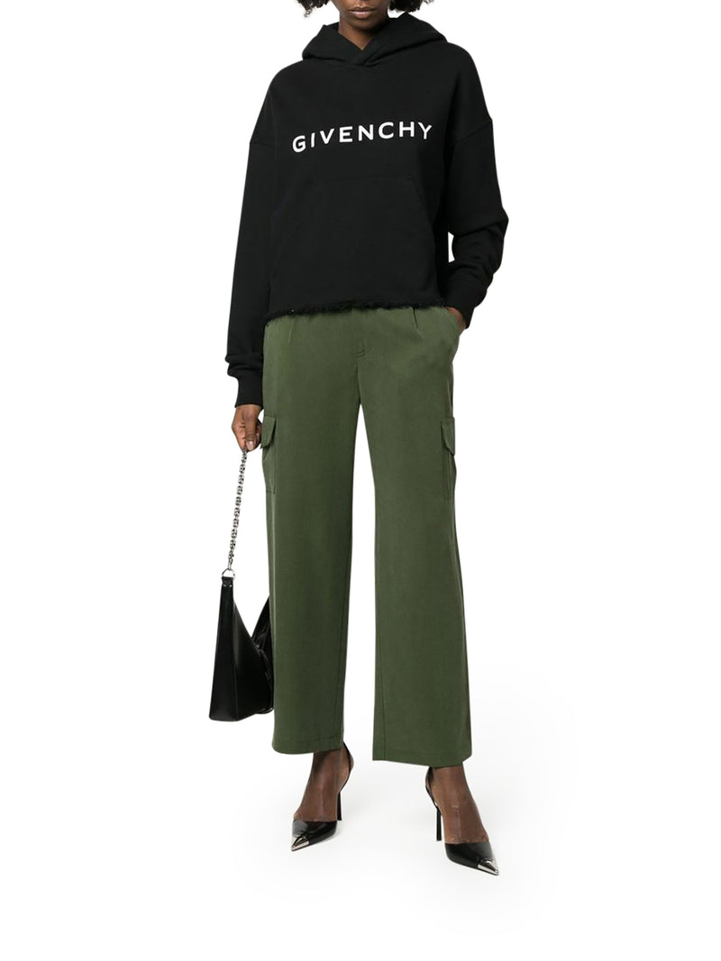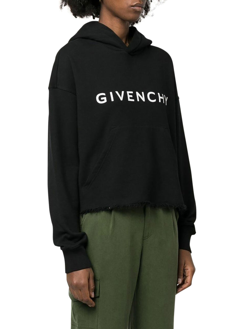 Black/white, cotton, logo print on the front, logo print on the back, fringed trim, hood, long sleeves, straight hem and front kangaroo pocket.