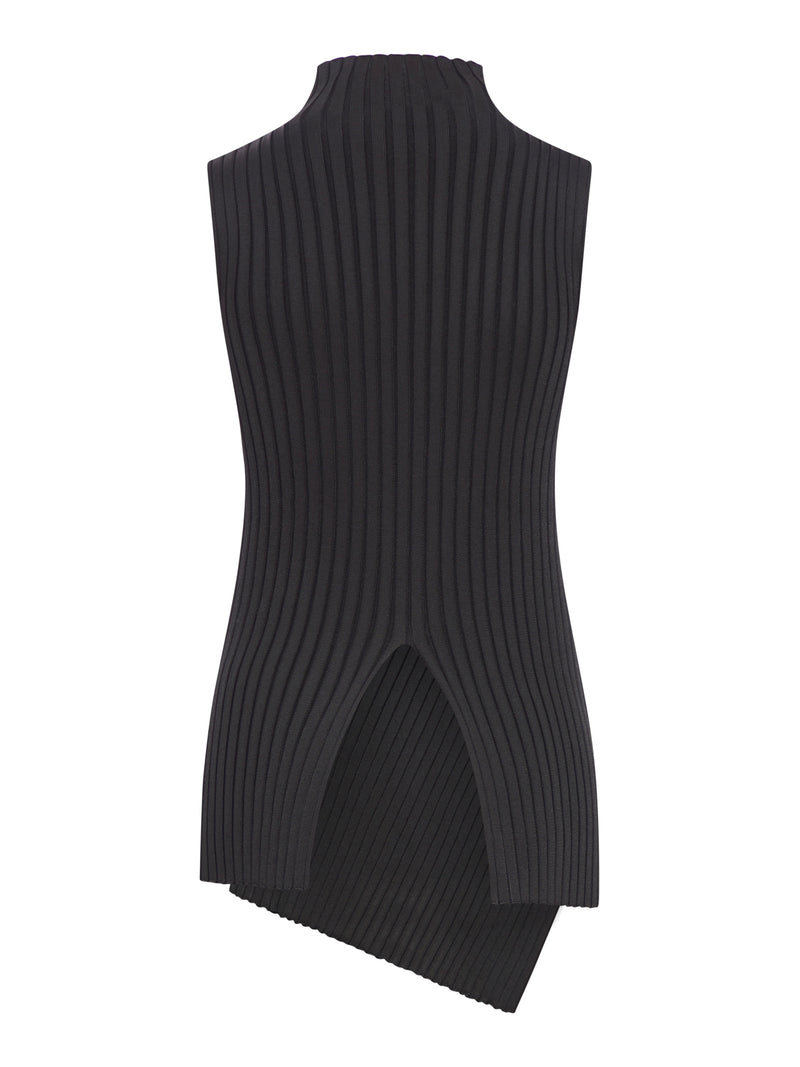 -black -knitted design -ribbed knit -asymmetrical design -silver-tone engraved logo pin -mock neck -sleeveless -back slit -asymmetrical hem