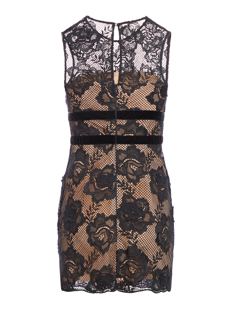 -mini cut -crew neck -armholes -lace -velvet bows at the waist -back zip