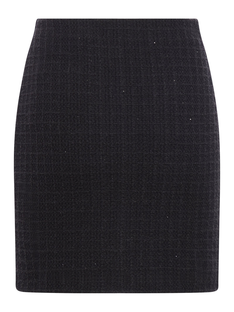 -black -knitted design -checkered pattern -mini sequin embellishment -two front patch pockets -jeweled buttons -above the knee length -unlined design -straight hem -elasticated waist