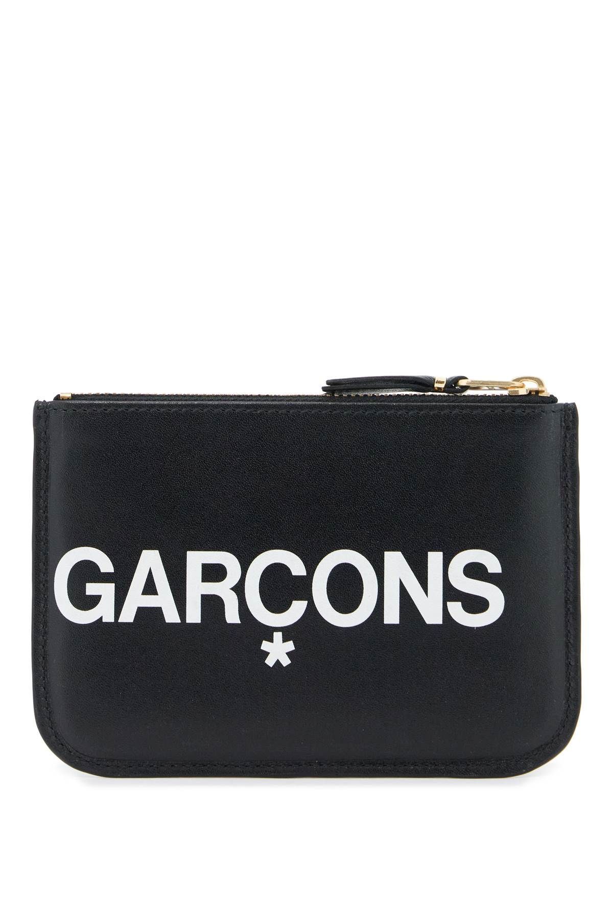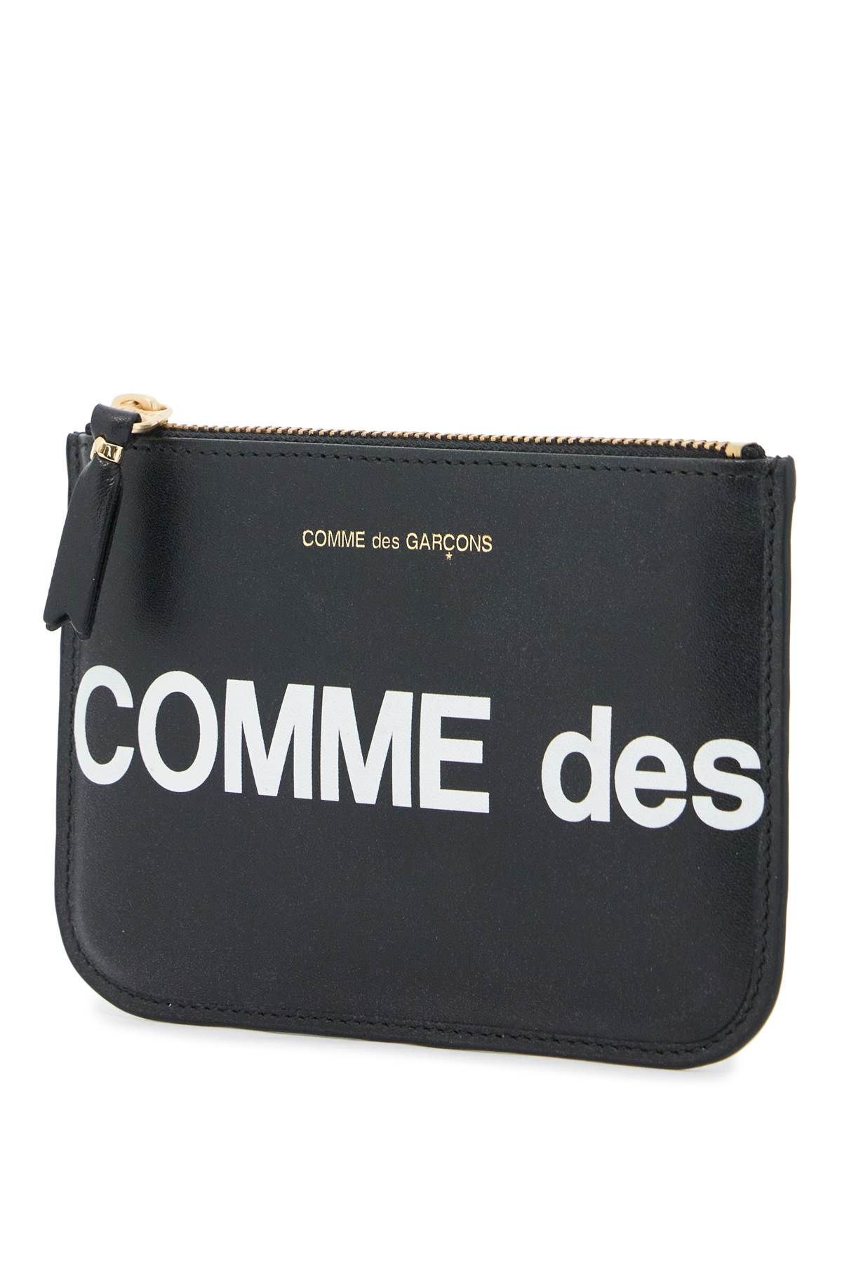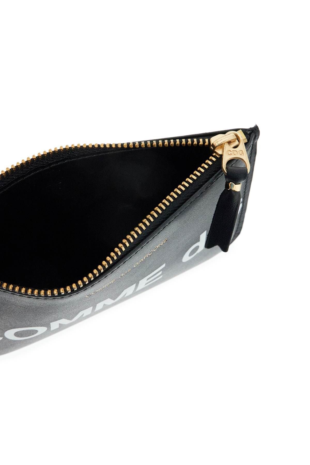 Comme des Garcons leather pouch with contrasting maxi logo print, zip closure and gold-tone logo print on front