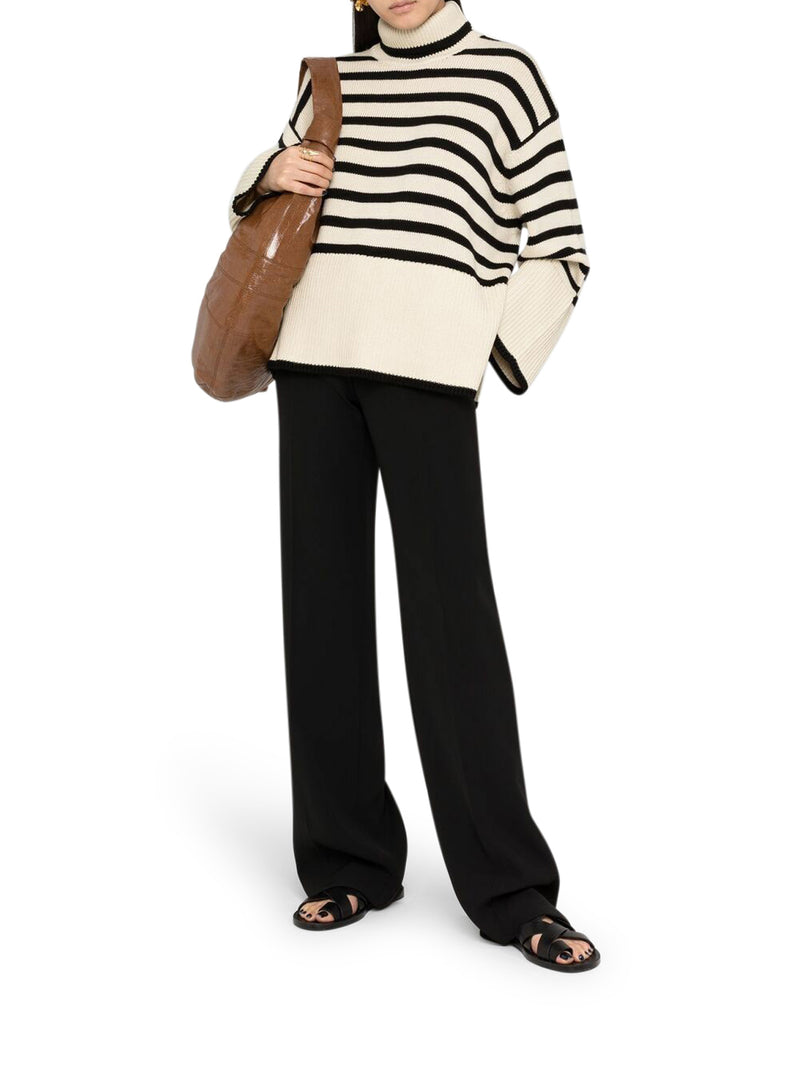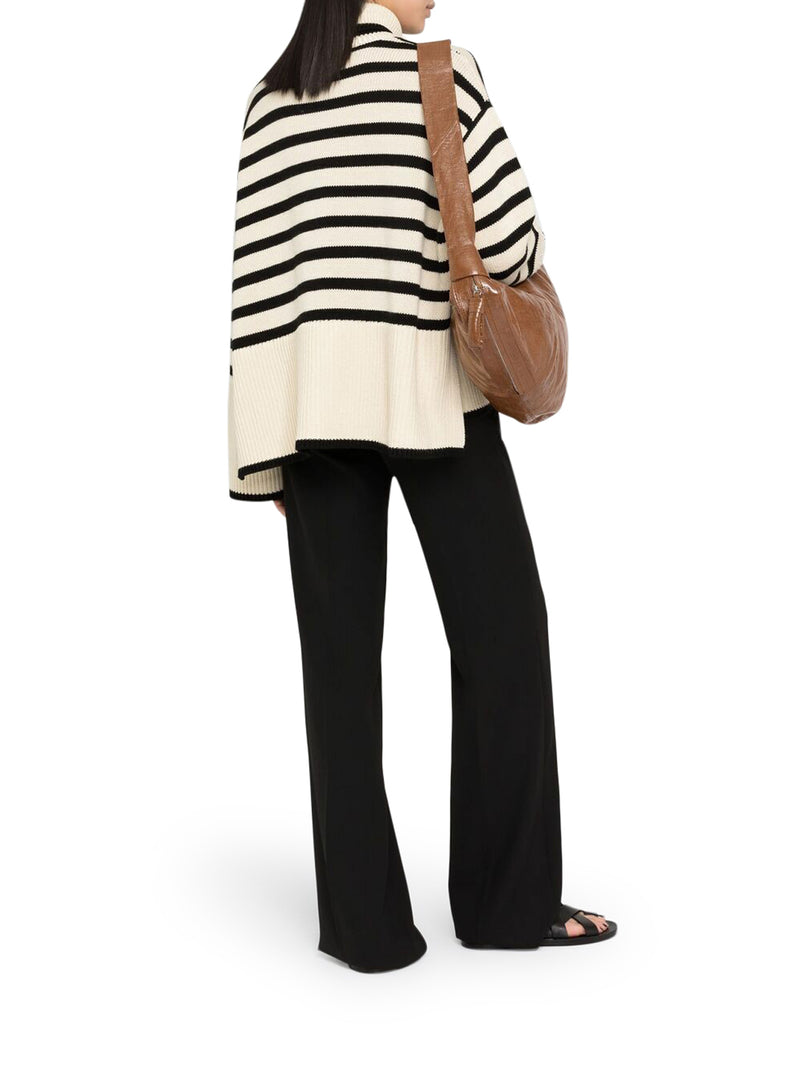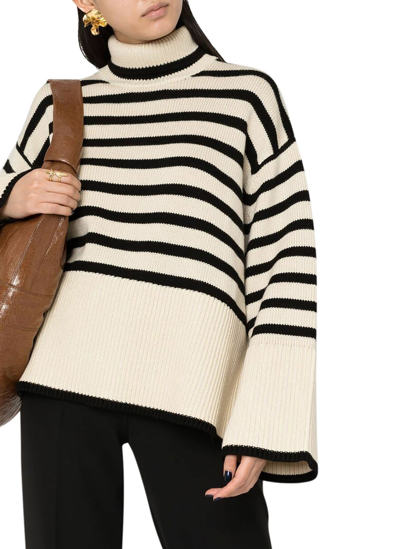 -Knitted design -Horizontal stripe print -High neck -Long sleeves -Straight hem -Side slits