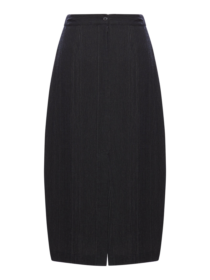 -Lined balloon-line skirt in wool blend fabric with a pinstriped pattern and a wavy look -2 patch pockets with 2 free pleats -Zip and button fastening -Overlapped slit on the back -Black