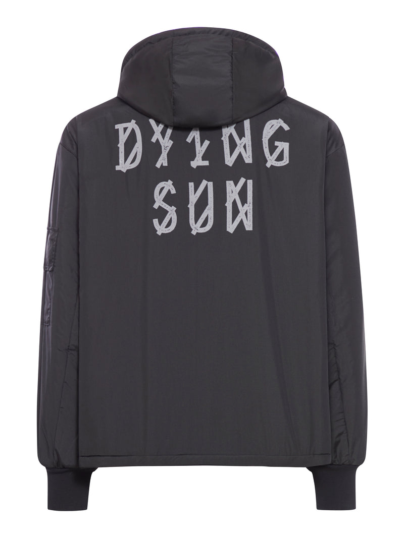 -front zip -buttoned welt pockets -hood with drawstring -sleeves with elastic cuffs -black