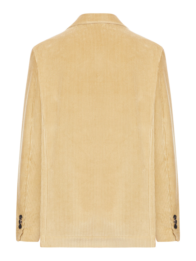 -Single-breasted beige corduroy jacket -peak lapels -two-button front closure -two patch pockets on the front -one triangular pocket with buttoned flap on the chest -buttoned cuffs -Regular fit