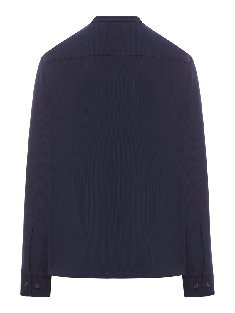 -wool blend -tone-on-tone stitching -collarless design -double-slider zip front closure -long sleeves -buttoned cuffs -curved hem -Blue