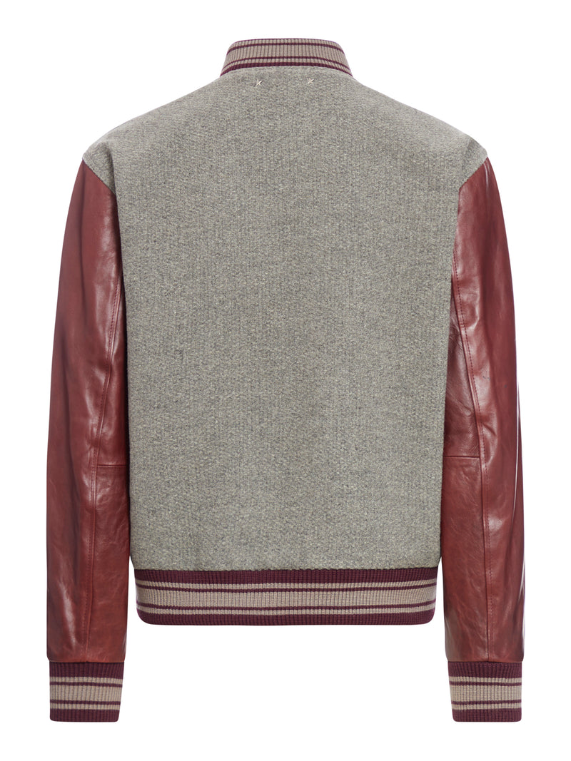 -medium grey/burgundy -virgin wool/sheepskin -color-block insert design -front fastening with press studs -band collar with striped design -contrast fabric sleeves -long sleeves -applique detail -two diagonal side pockets -logo plaque on the back -internal bellows pockets -jacquard logo lining -striped ribbed hem and cuffs
