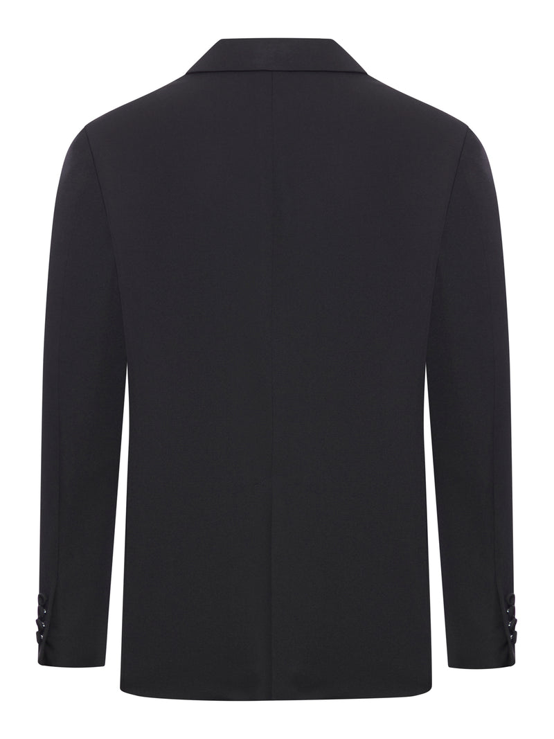 - Black wool - Covered buttons and gold-tone Round Interlocking G button - Double-breasted jacket with peak lapels, breast pocket, two front flap pockets, inside pocket and back vent - Straight leg trousers with split hem, belt loops, slant pockets, buttoned back pockets and hook and zip fastening