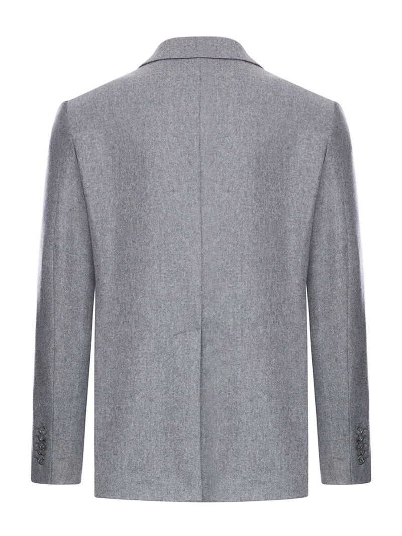 -double-breasted -mother-of-pearl buttons -buttonhole with metal pin -flap pockets -classic lapels -straight-leg trousers -belt loops -back welt pockets -side welt pockets