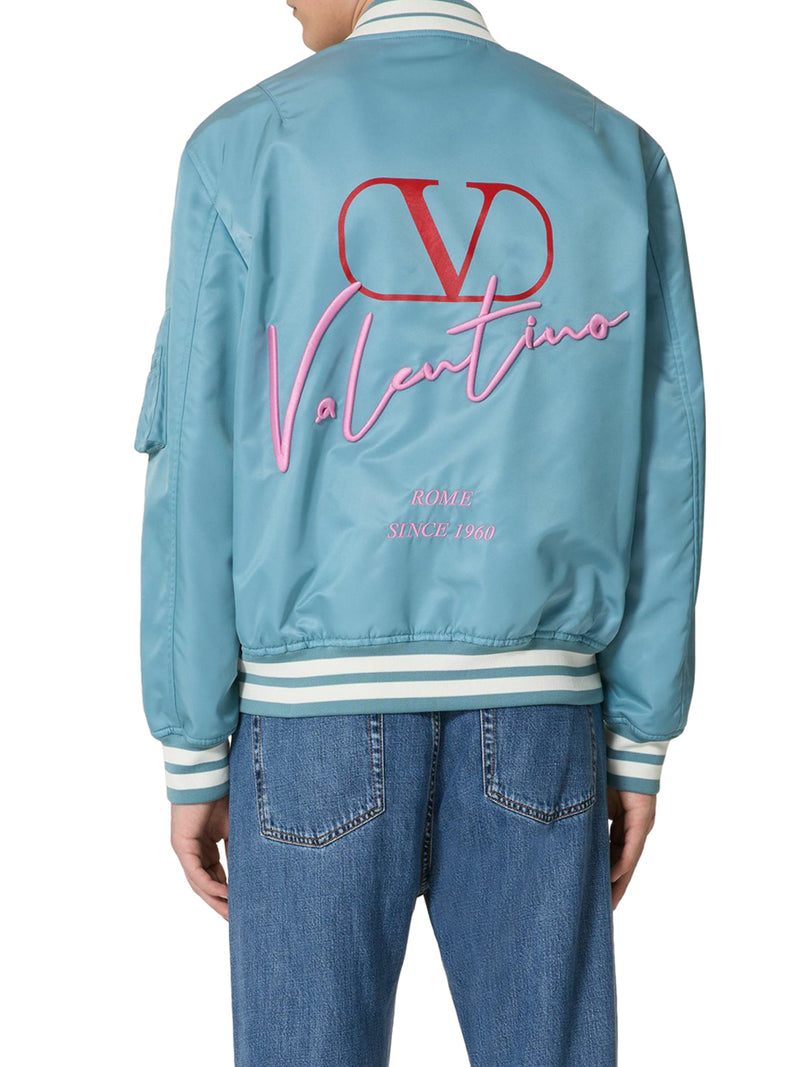Valentino nylon bomber jacket with Valentino embroidery and VLogo Signature print - Regular fit - Lined - Lightly padded - Valentino embroidery on both sides - VLogo Signature print on the back - Zip fastening - Two side pockets with flap - One zip pocket on the left sleeve worn side - Elasticated ribbed trims