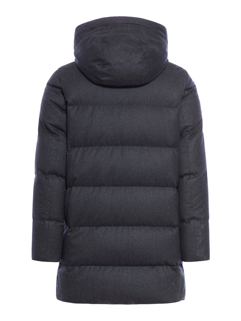-hood with removable drawstring -front closure with zip and buttons -side welt pockets -anthracite grey