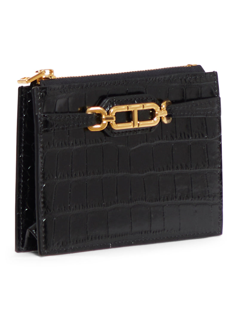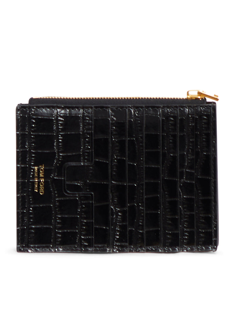 -front metal clamp with logo -top zip -credit card slot -crocodile print leather