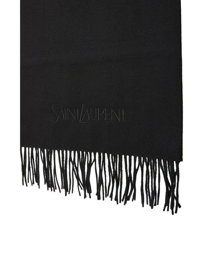 Black cashmere scarf with tone-on-tone Saint Laurent embroidery. Frayed bottom. Dimensions: 35x180cm