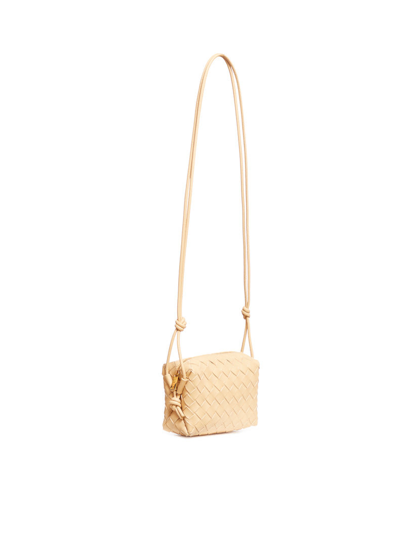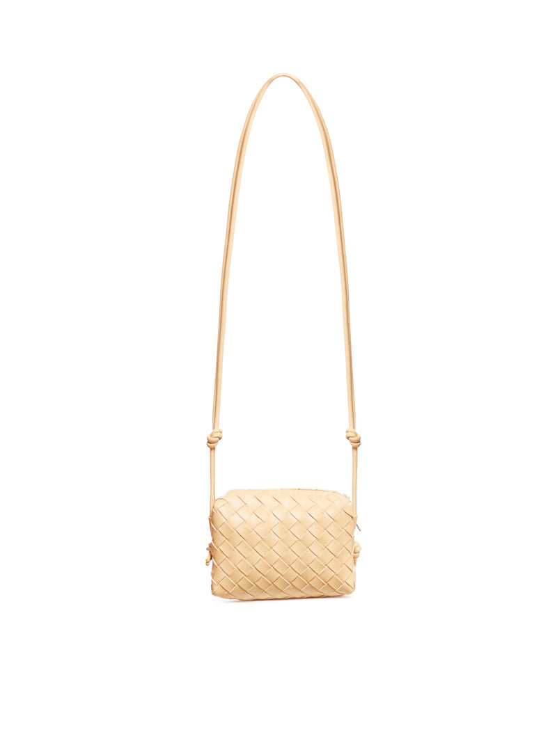 ? Mini cross-body bag in leather with Intrecciato motif ? Single compartment ? Zip closure Material: 100% Lambskin ? Interior: calfskin ? Metal accessories: gold finish ? Height: 11 cm ? Width: 17 cm ? Depth: 6 cm ? Shoulder strap drop: 55 cm