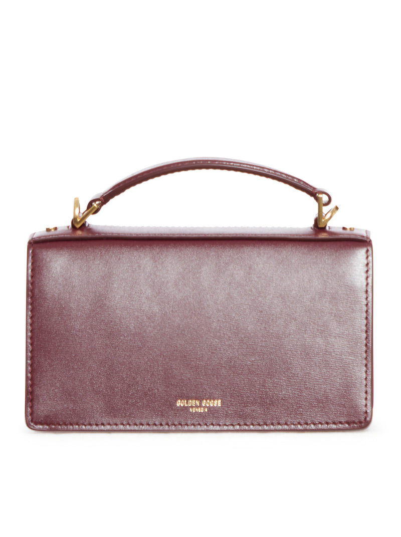 -calfskin -smooth grain -rectangular model -flat handle -adjustable and removable shoulder strap -single compartment -full lining -gold-colored details -gold-colored lettering logo -front closure with clasp