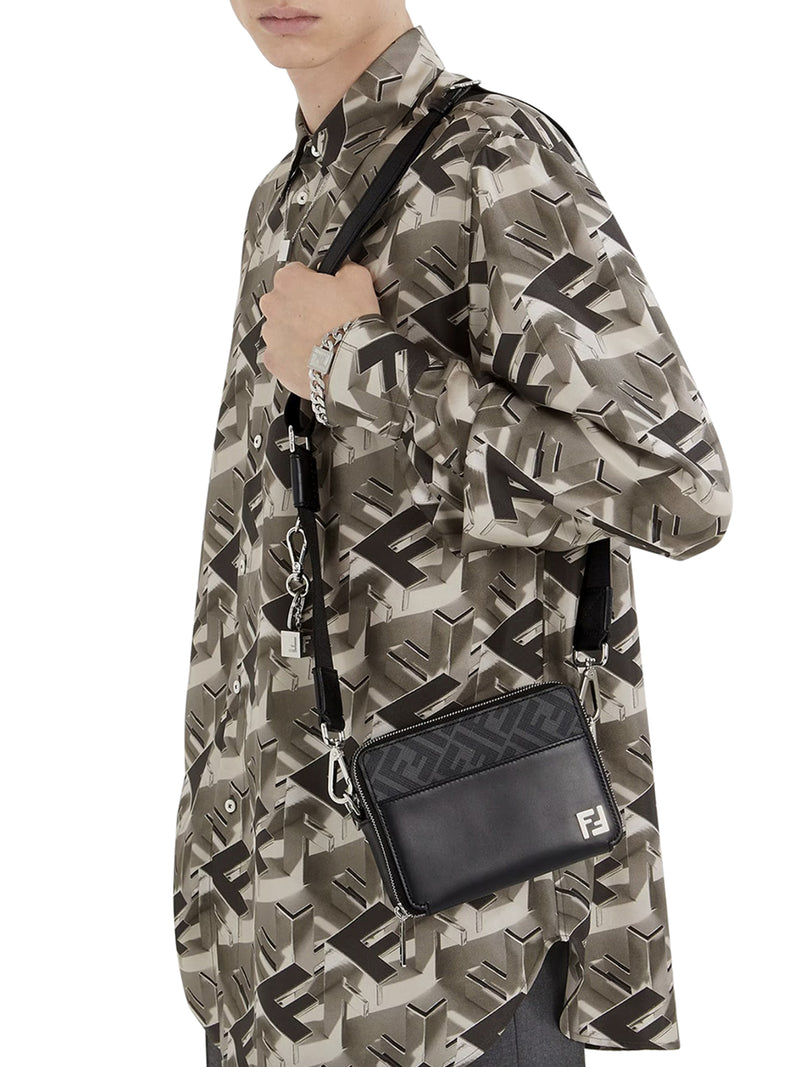 Compact camera case made of black leather and FF fabric in shades of gray and black. Decorated with a metal FF application. Equipped with an external flat pocket, two zipped compartments, 3 internal card slots and palladium-finish metal accessories. Adjustable and removable Fendi lettering ribbon shoulder strap.