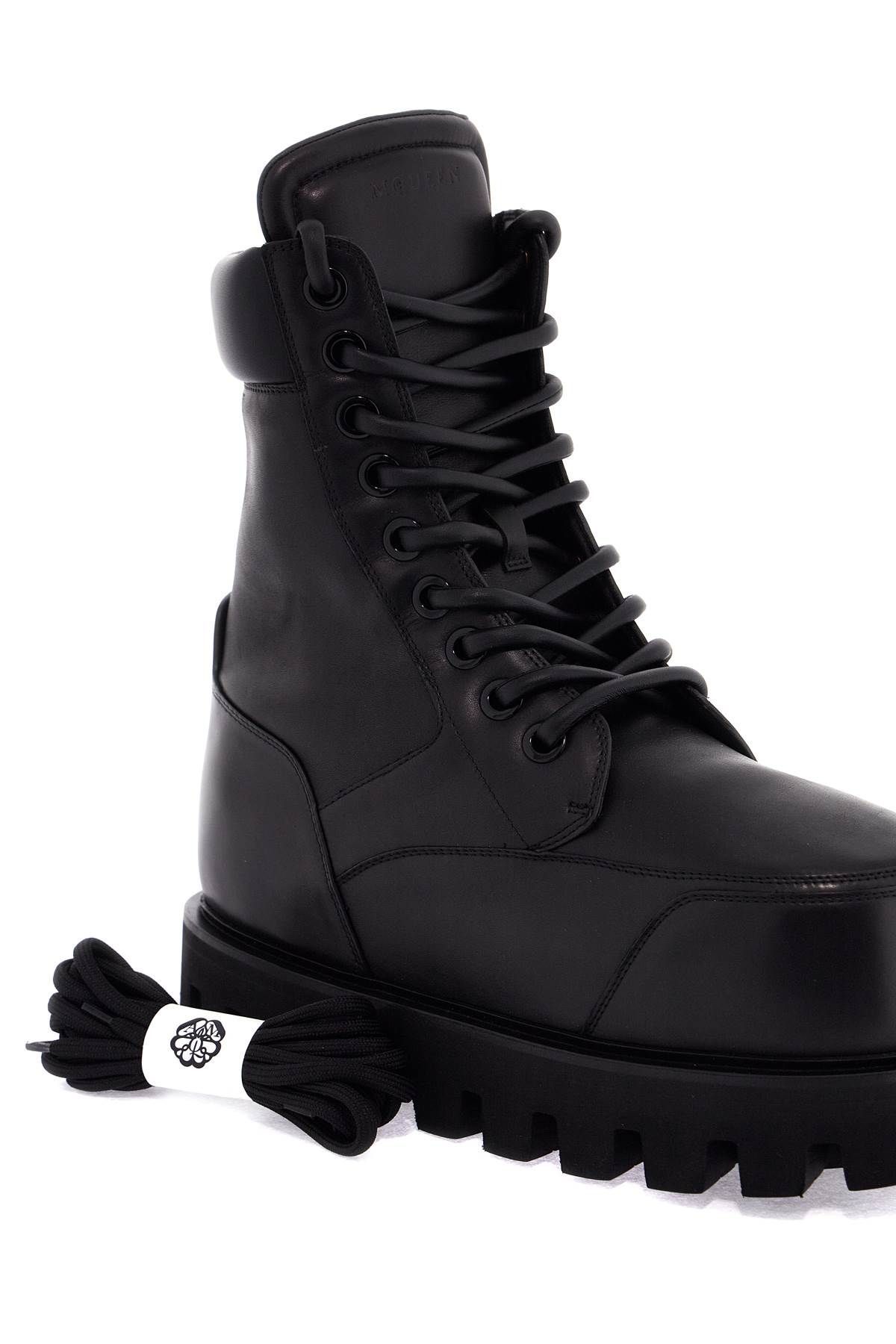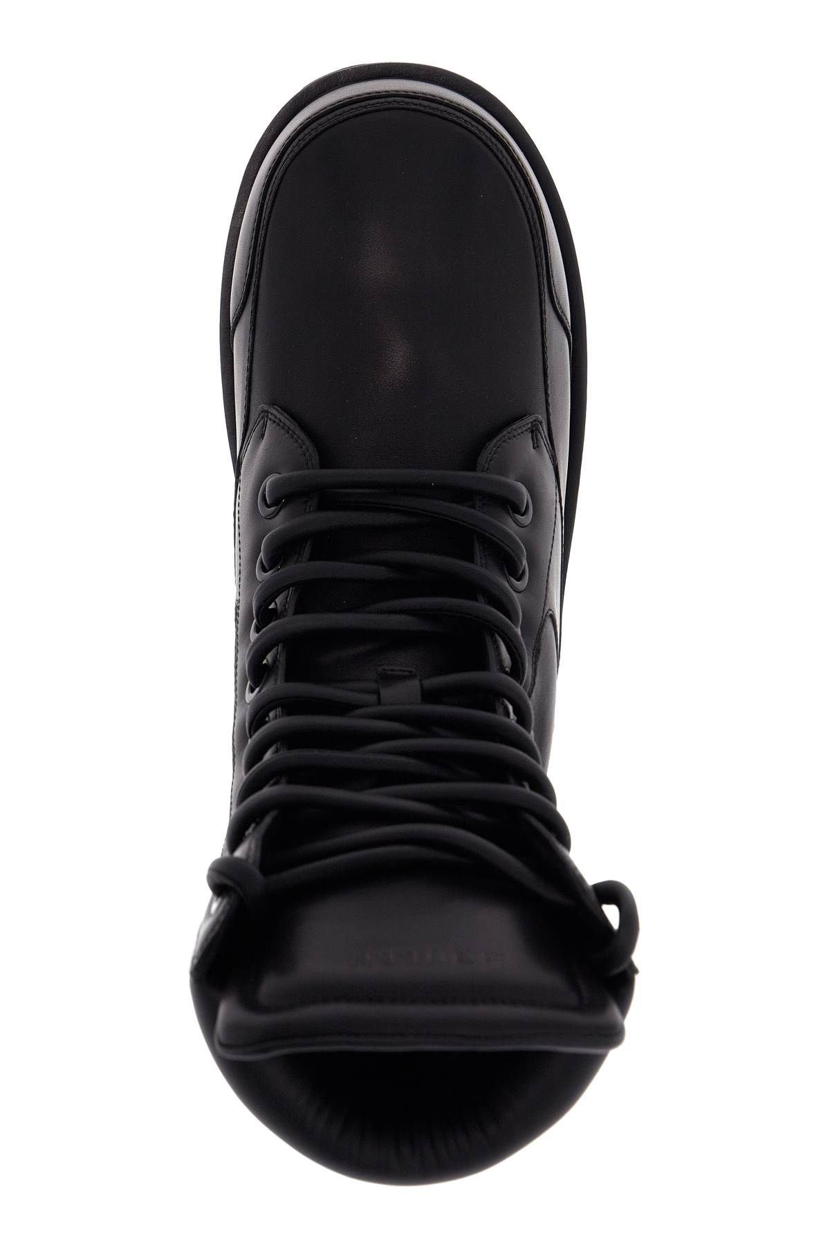 These Alexander McQueen ankle boots are made of smooth leather and feature a voluminous and exaggerated design with padded ankles, tubular laces, and padded toe