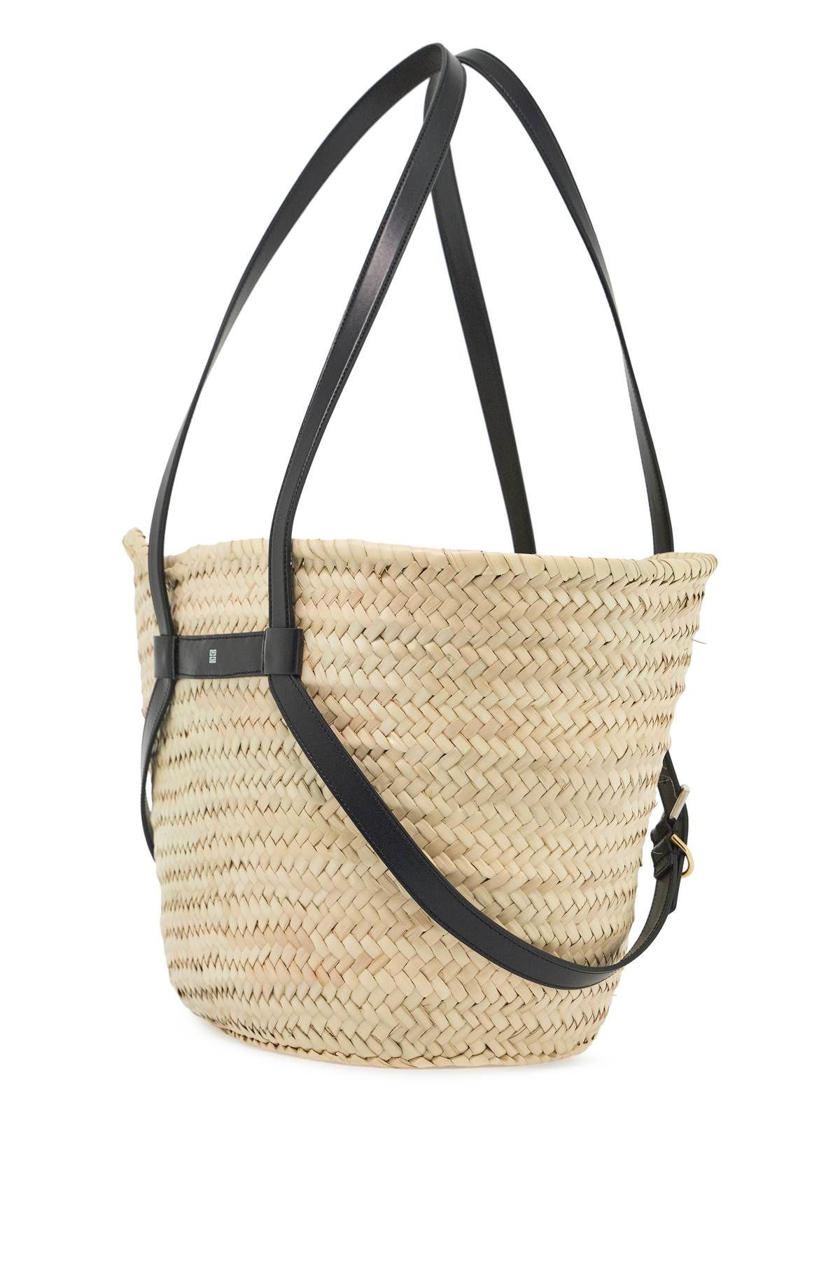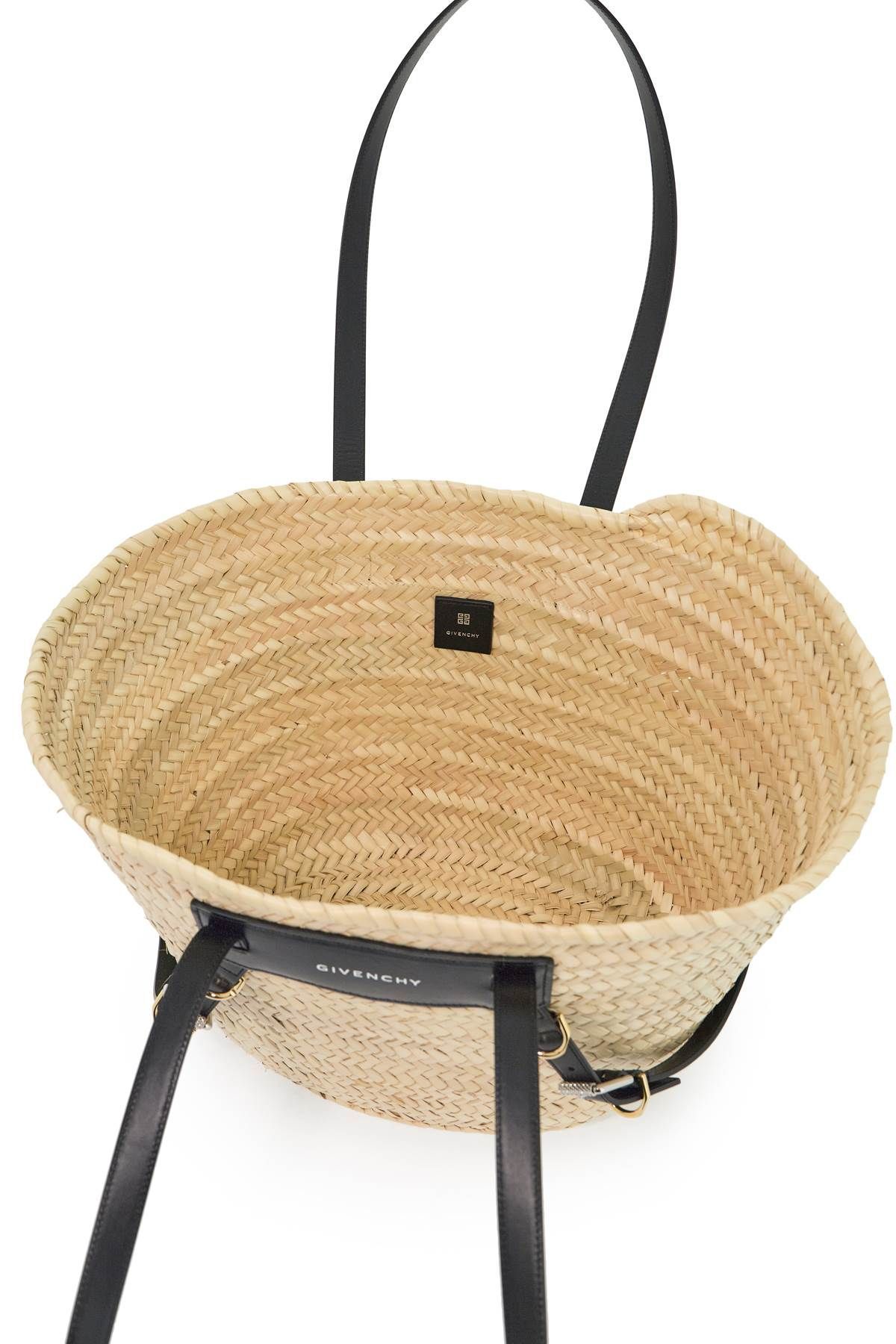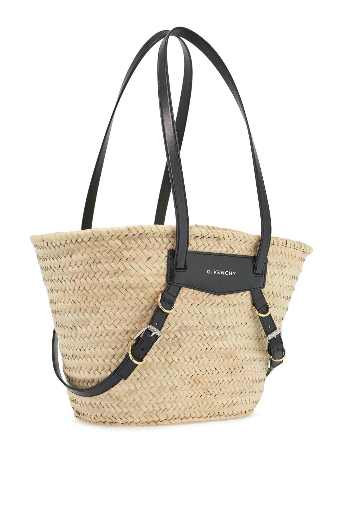 Givenchy Voyou shoulder bag crafted in woven raffia with leather cross straps with gold and silver metal buckles and V-cut leather insert with lettering logo